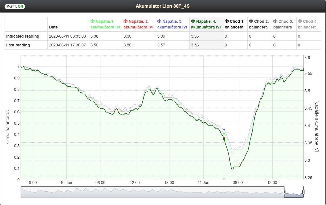 Za celú dobu sa napätie rozchádza len minimálne (0,01 až 0,02 V), balancer sa zatiaľ nemusel zapnúť ani raz.