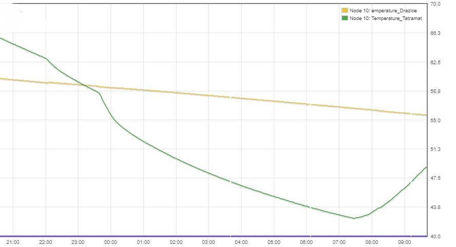 V grafu jsou vidět teploty přes noc po sprše ve 23:45 a ráno od 7:30 už hřeje sluníčko (jen do Tatramatu). Je tam vidět, jak Tatramat ochotněji chladne (určitě je ten pokles rychlejší o tu nateklou studenou vodu, asi se postupně míchá, ale má i slabší vrstvu izolace a je menší).