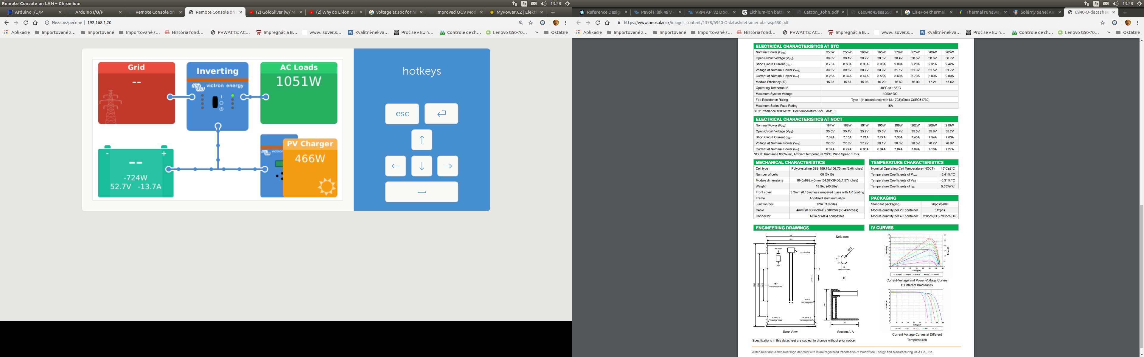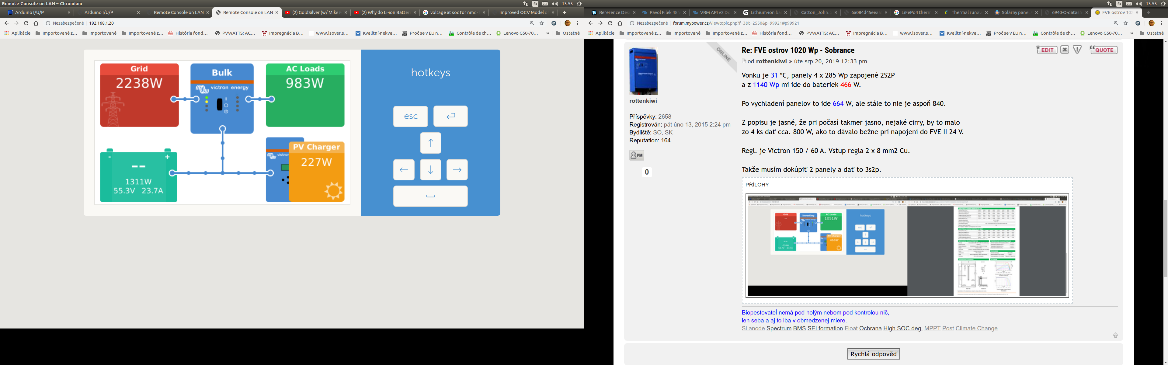 Téma popisuje zkušenosti s provozem ostrovní fotovoltaické elektrárny o výkonu 1020 Wp v Sobrancích. Autor sdílí detaily o komponentách systému, jako jsou panely, baterie, regulátory a měřicí zařízení založená na Arduinu. Součástí je i ochrana proti přepětí a statistiky výroby energie od roku 2014. Diskuze zahrnuje i otázky kompatibility měničů Victron a technické aspekty spolehlivosti komponent.