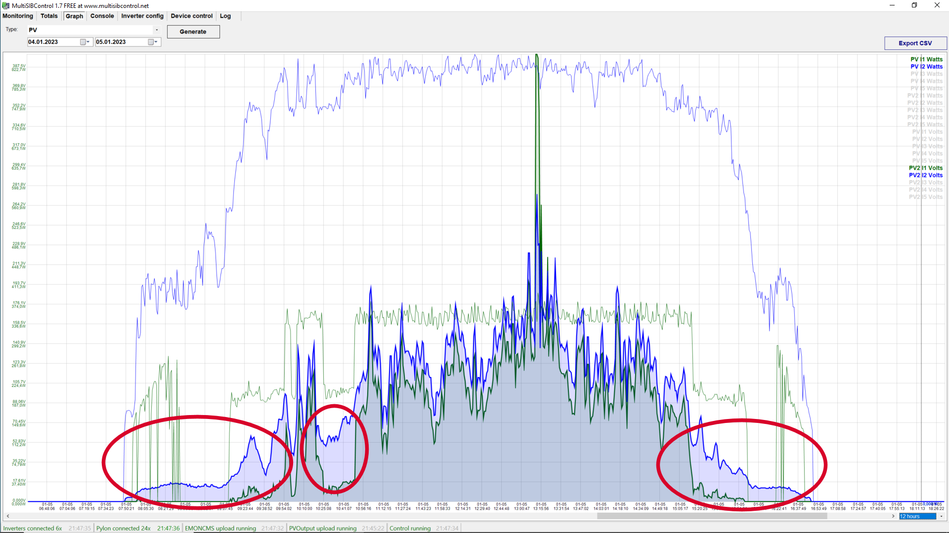 Nerozumim tomu, proc by kombo HV menic se mel nejak flakat. Mam nize zminenou vysokonapetovou verzi EASUNu a funguje normalne od minimalnich vykonu do maximalnich vykonu. Nize uvedeny graf ukazuje prubeh vykonu na jednom menici s jednim vysokonapetovym stringem z dnesniho dne odecitaneho kazde 2 sekundy. Dnes bylo pocasi nic moc, tu a tam aspon trochu vykouklo slunce. Na grafu je videt ze HV MPPT normalne generuje od rana, kdy zacal na 14 W.skybor píše: pon říj 30, 2023 5:56 pmEASUN sotva ucítí někde sluníčko, tak není líny ždímat první Watt (to ještě kombo HV měnič pěkně spinká a pak se jej marně snaží dohnat, ale dokud nemá aspoň ty 2A tak ho nedožene ...