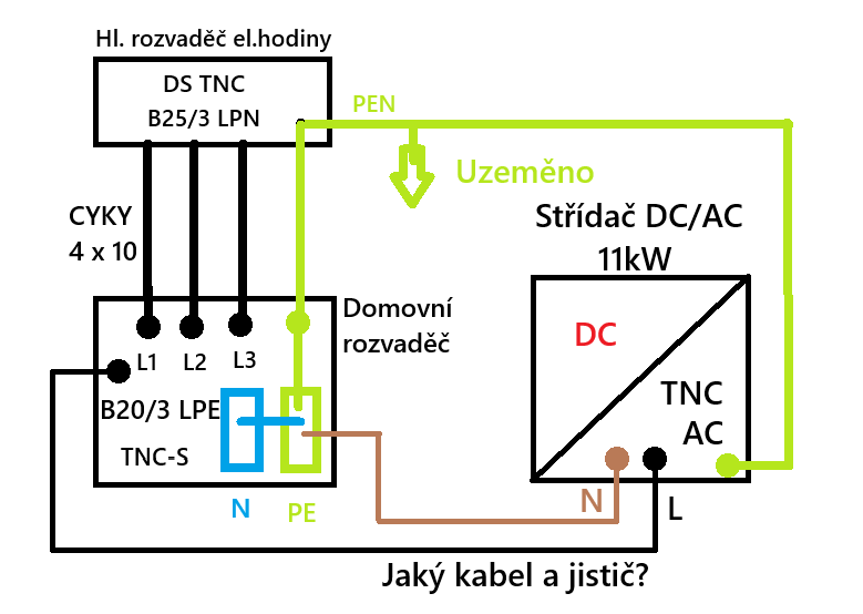Ten jistič je předpokládám OK? A když potáhnu teda CYKY 3 x 10 tak žz u střídače na PEN svorkovnici a v domovním rozvaděči žz a N na PEN...
