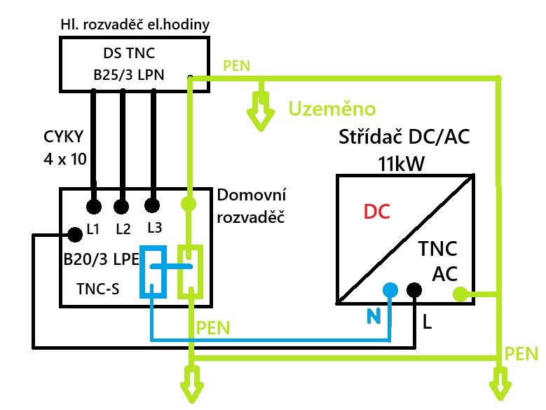 Z něj jde kabelem CYKY 4 x 10 do domovního rozvaděče TNC síť která se v rozvaděči dělí na TNC-S síť. Do tohoto rozvaděče potřebuji dovést CYKY kabel od střídače. Střídač je uzemněný na společný PEN domu.