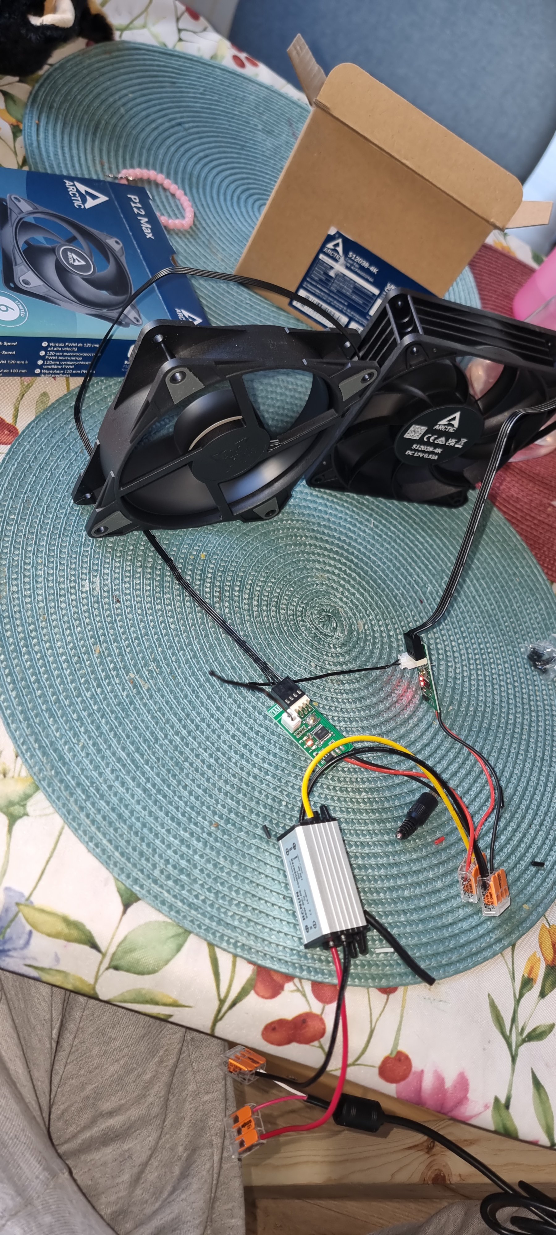Tak tenhle modul pwm mě moc neoslovil, regulace nelze posunout nad 30°C, aby max měla výš. Zato ten Artic S12038-4K funí kotel na max a dělají i 8000otáček verzi taky za pár peněz. Bude to chtít jinej regulátor aby to nehučelo když nemá.