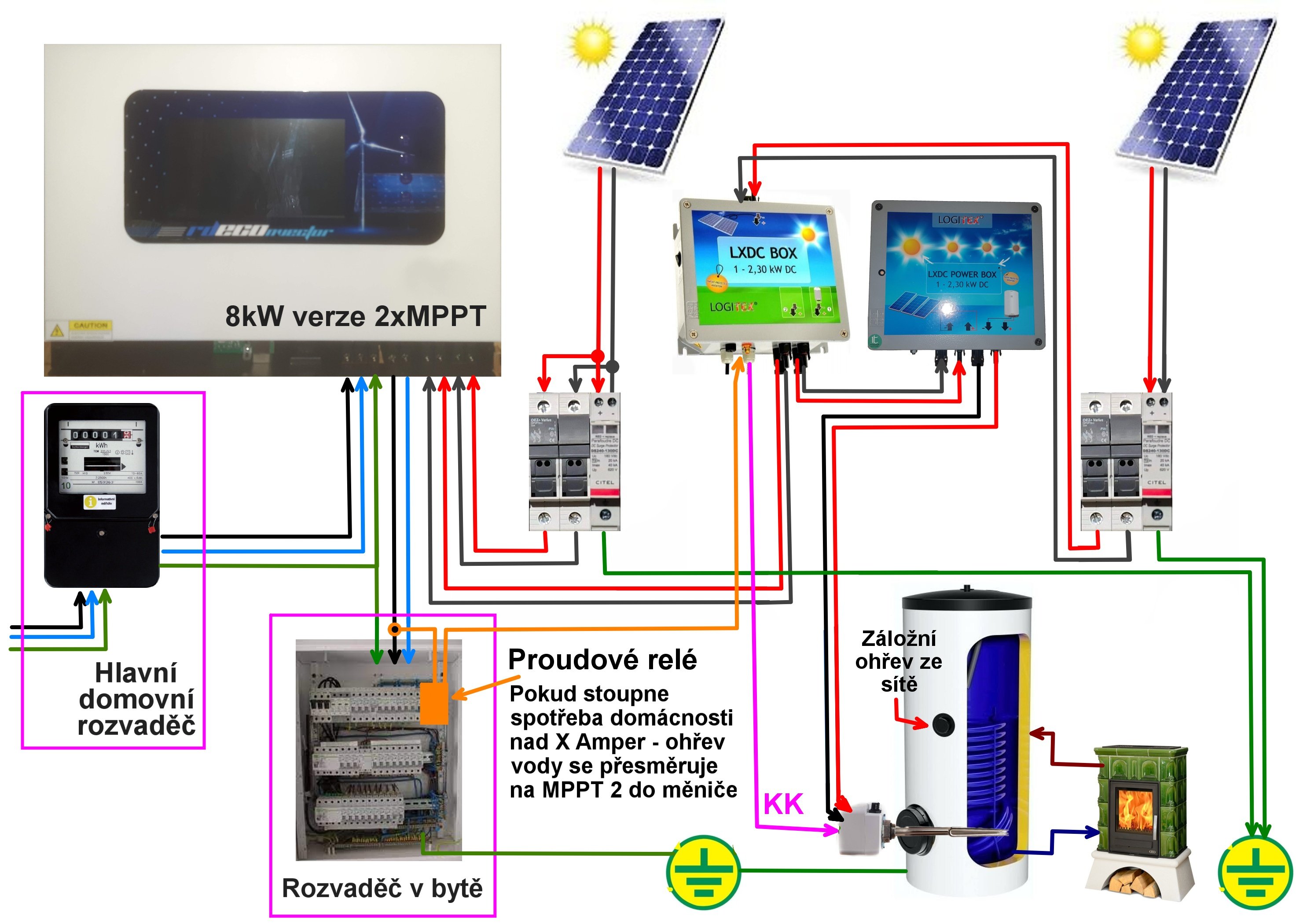 Idea je ta, že jeden String valí non-stop do domácí sítě, druhý do vody, když se voda ohřeje, nebo sepne něco většího (třeba nad 8A) , připne se i druhý string do domácí sítě hned.