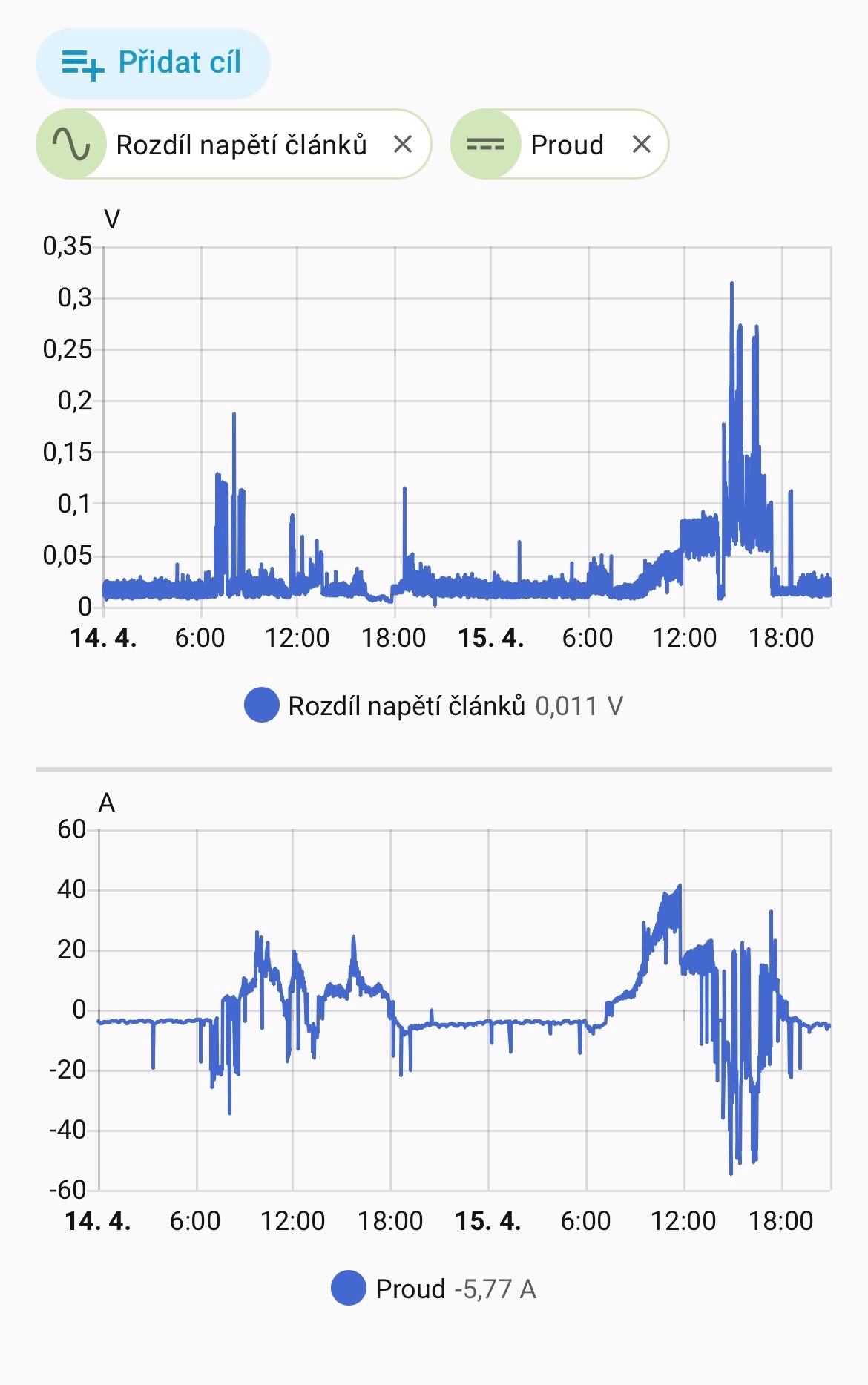 ok, takže řešíte to, jestli na těch článcích kolísá napětí nebo že to blbě měří BMS? A o jaký hodnoty napětí jako jde? Teď jsem to byl namátkou omrknout, odběry cca 20A a sem tam na některým článku to měřený napětá poskakuje o méně než 10mV, tj nechává mě to úplně chladným. Mám dost vážnějších starostí, než řešit chybu měření napětí na úrovni 2* LSB ADC v dané BMS...