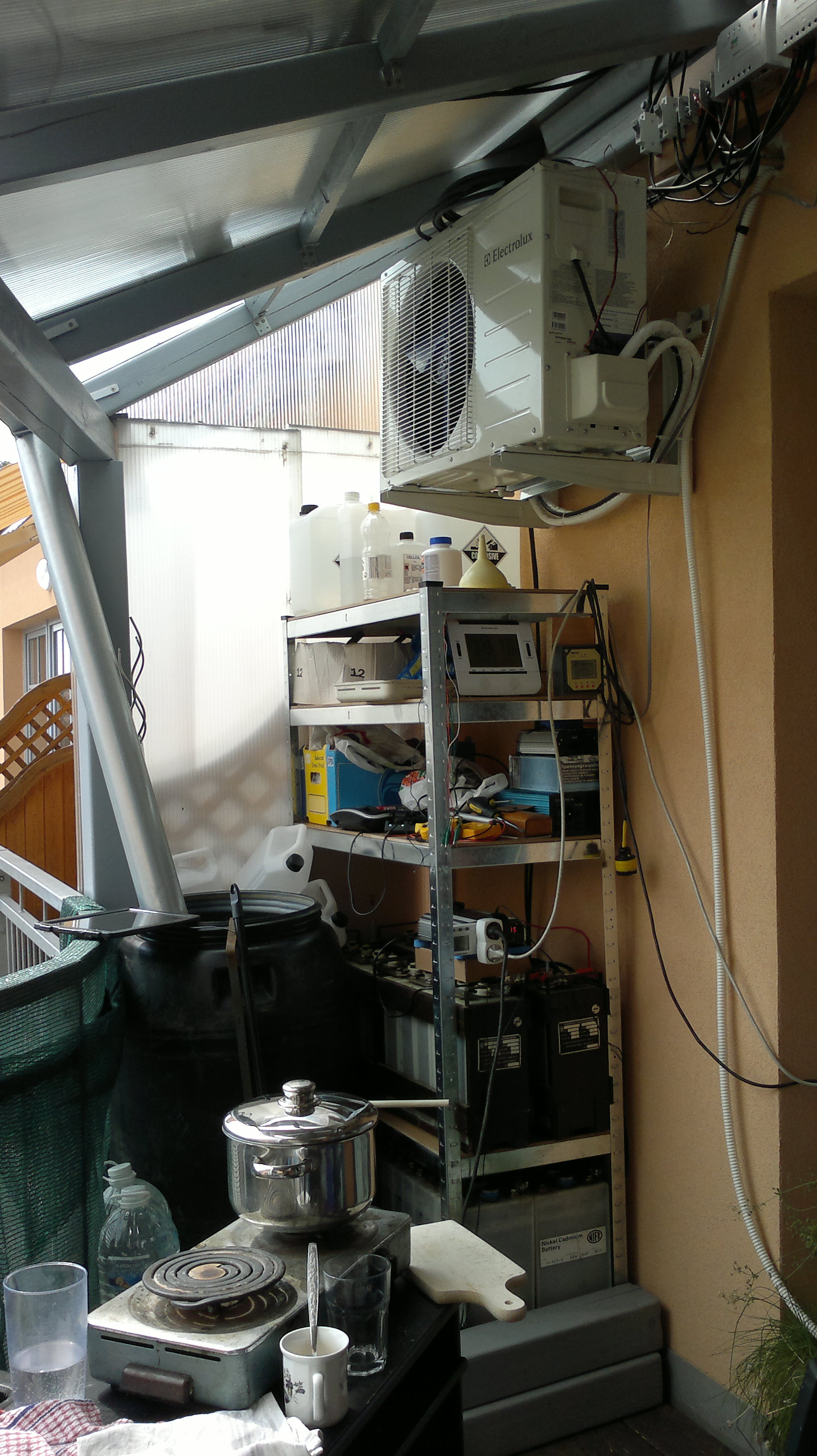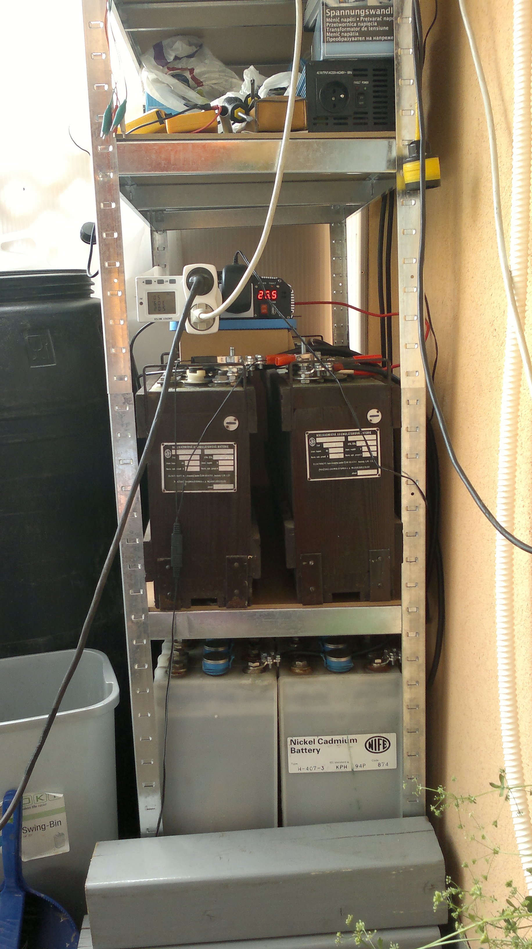 1kW sinus měnič mi jednou v noci začal pískat a nejede, tudíž teď frčím na záložním sinus 600W. Zatím v poho dává vše, kromě klima (tv, pc, wifi, lednice, rychlovarná konvice, sterilizátor, vařič, radio atd.). Zhruba v září bude power jack 5kW, ať mám pokoj. Včera jsem zakoupil novej regál, tak konečně poskládaná baterkárna a zbylo i místo skoro na všechny krámy okolo.