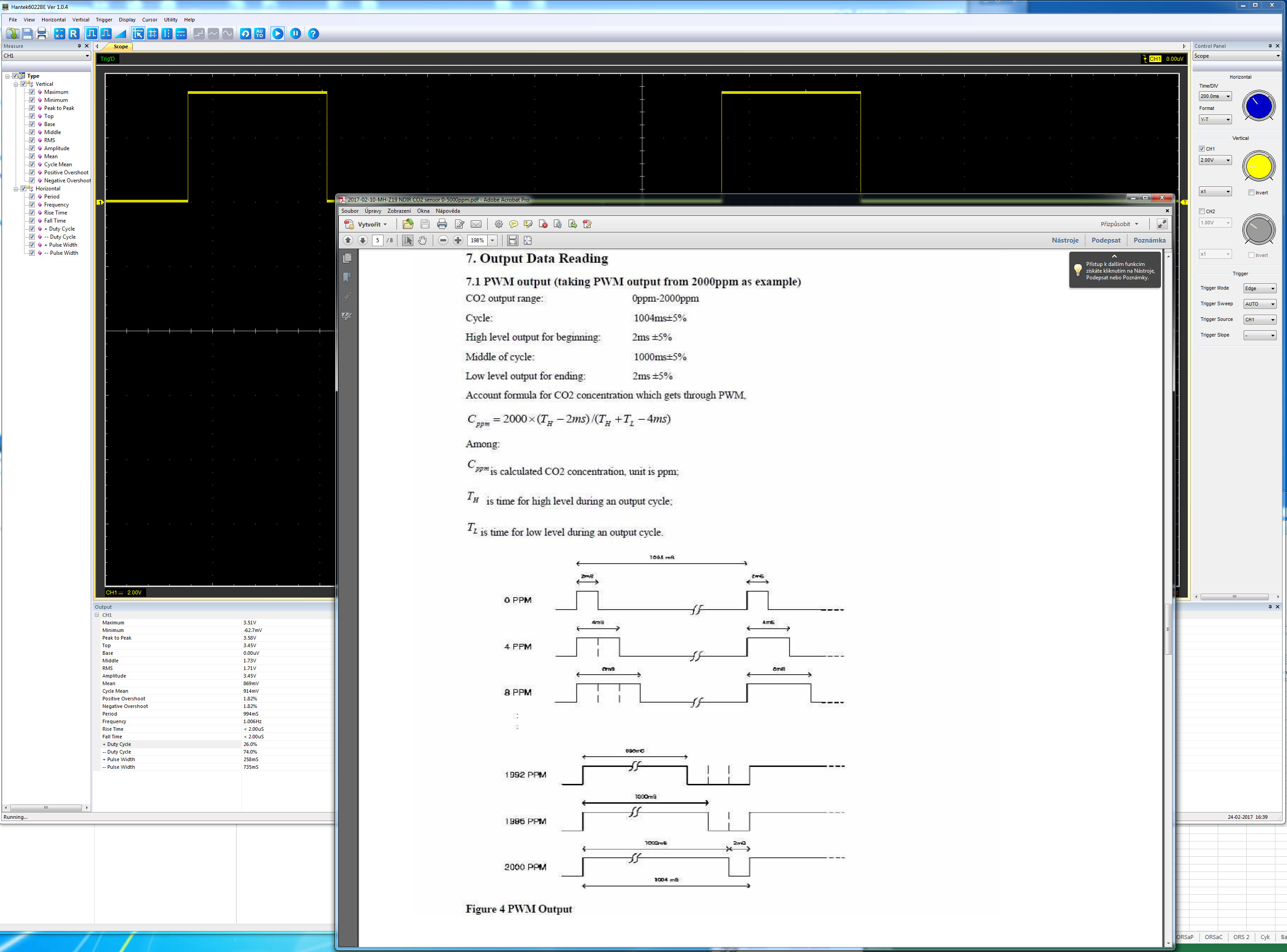 Koncentrace CO2 se vypočítá vynásobením šířky PWM signálu v ms dvěma. Takže pro příklad z obrázku je hodnota CO2 v ppm 198 x 2 tedy 396 ppm +- 50ppm (chyba senzoru).