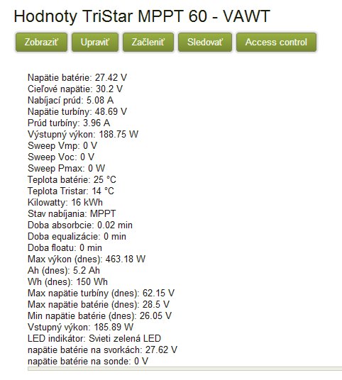 V prílohe je screen stránky výpisu z TriStaru pred hodinou. Denné Wh tam sú v hodnote 150, to je preto, že sa mi TriStar preklopil o 19 h. do ďalšieho dňa. Nefunguje ako solárny regulátor, tak nevie kedy je noc