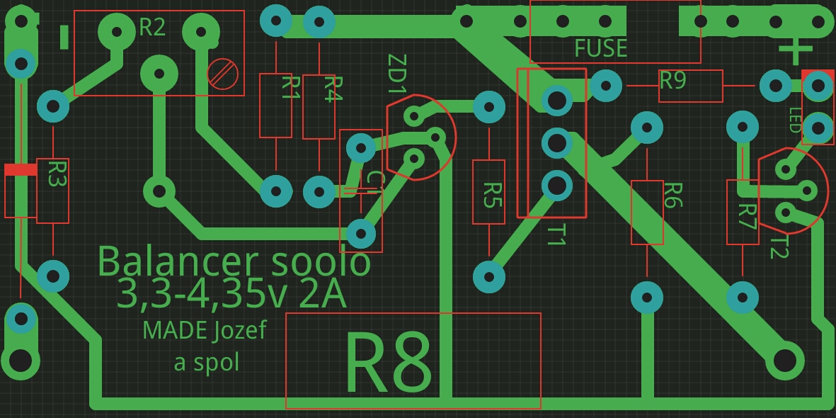 Zdravím, je to celkem v pořádku, akorád je otočená ta dioda D1 a dle schéma ZD1 stabík je označen jako T3, název DPS Balacer Soolo 2AJonasPP píše:Už som našiel tu zložku de to ukladalo a mam akykolvek format bude treba.Zhruba som to ukončil takto.Ak treba tak dam aj zoznam sučiastok,ale R1,R2 a R3 chcem ponechať na volbe kupujuceho.Mikel píše:Pojistka asi bude orisek aby byla na desce. Nasel jsem max 15A a to je malo