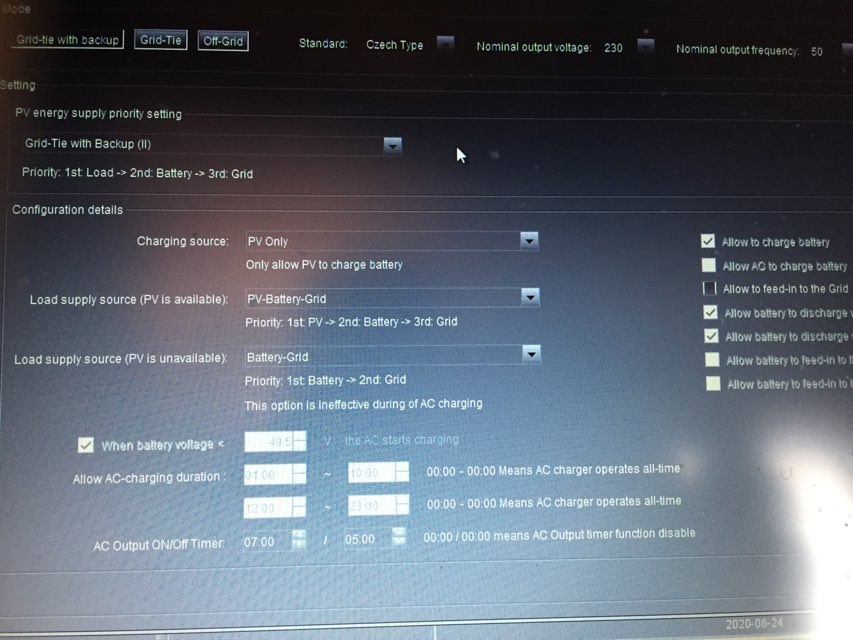 Ahoj všichni, nevím_ ale já musel hodit default a nastavit jednotlivé parametry znovu, aby měnič si vše řádně zmapoval v opakovaném nastaveních jednotlivých parametru, které nechtěl jen tak pobrat _ nakonec se úspěch dostavil,až vše řádně načetl a zapamatoval. . V každém případě režim GridTie with Backup + Eastron, musí být nastaveno EC ON-2.Přetoky mám zakázané, max přetok 1kW při denním maximu výkonu, jak tady zmiňoval youda,AKB nabíjeny jen z PV max proudem 60A. Vybíjení, čili další podmínka _ PV,DS,AKB, max proud 100A. Můj problém byl, že jsem neměl min.napětí 350V pro PV charge startup voltage , kde výkon PV balancoval kolem několika watů, díky podlimitmímu napětí kolem 340V, což bylo skutečně málo. .Musel jsem nouzově spojit18 panelů do serie, tak že dnes je napětí při orientaci panelů JV a JZ až 650 V, což je v poho.Výkon nejde při běžném slunečném dni pod 3kW, s denním výkonem 15 až 17kW. Musím navýšit panely na každý string _ zatím o šest kusů, tak abych splnil podmínku min. napětí pro PV charge startup voltage 350V. Pak to pojede nezávisle, každý string s napětím min 450V až 550V. To bude limitně stačit, tak aby FVE s deklarovaným výkonem 5,4kW konečně naplnila mé očekáváni. Snad to málo pomůže někomu odlehčit trápení.