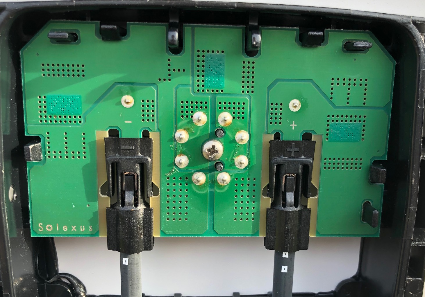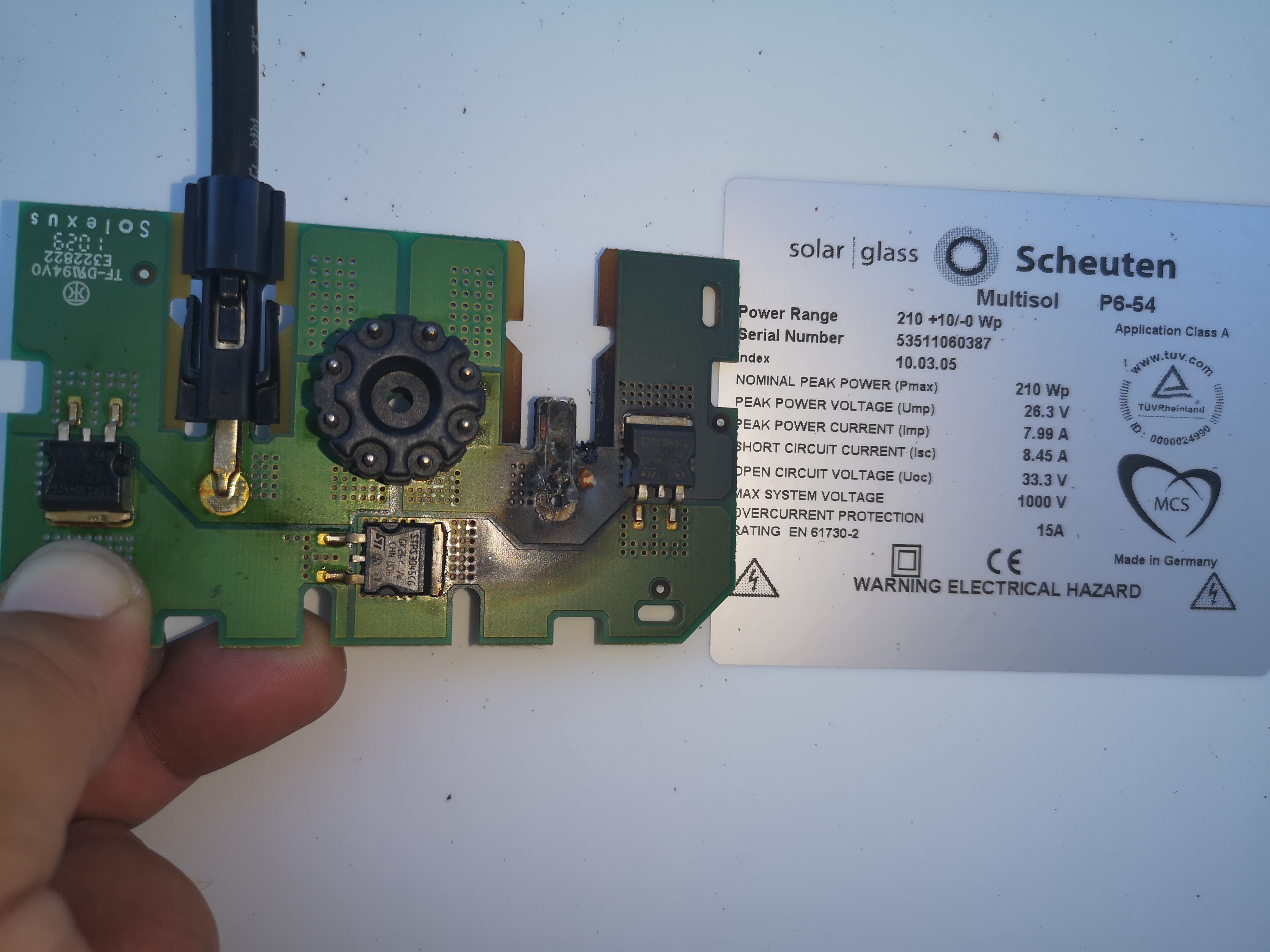 Při demontáži panelů s tím že budu instalovat nové profily pro 48V část elektrárny jsem se konečně dostal k nahlédnutí proč sakra ten jeden panel po zapojení nešel a musel sem ho bypassnout aby zbytek stringu jel a já ho nemusel pracně dostávat že střechy.