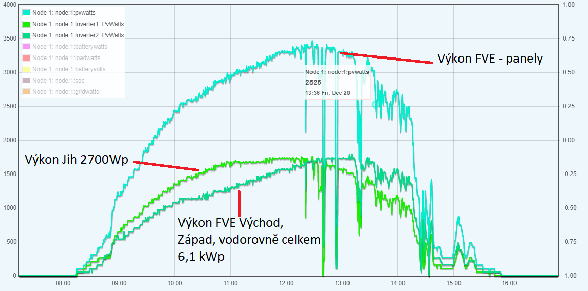 Pro zajímavost přikládám včerejší graf výkonu FVE - 2 x MPPT, vše vždy paralelně