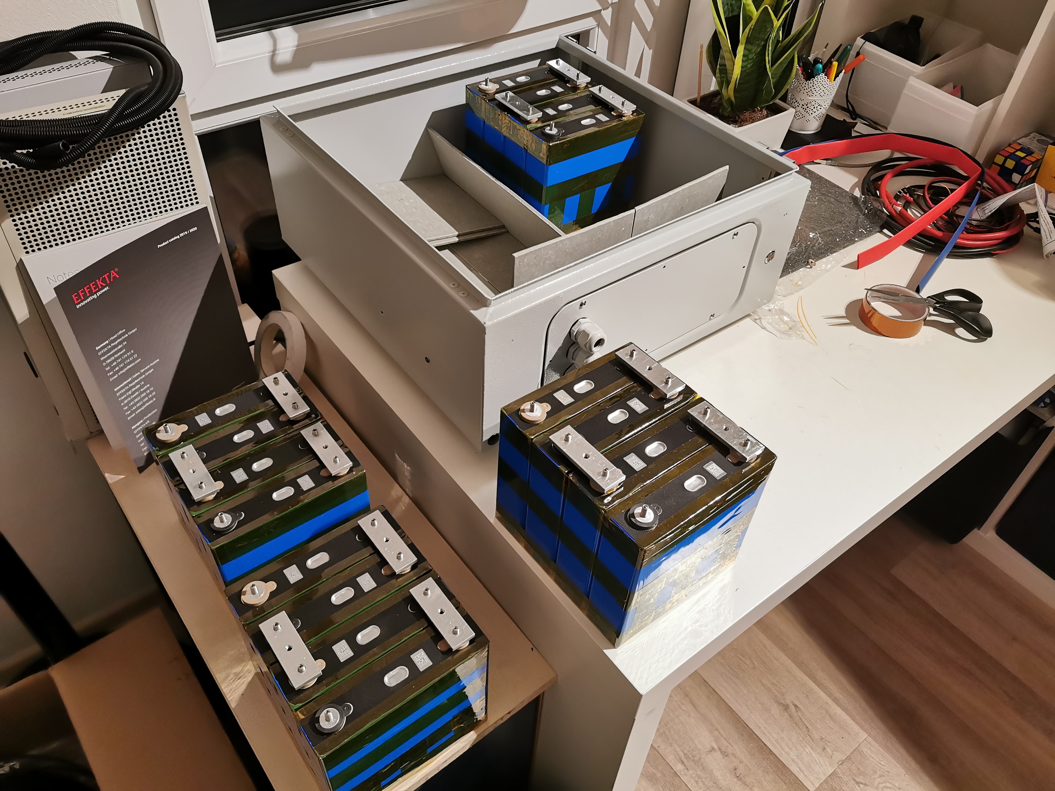 Tak dneska dorazily propojky od Franty. Hned jak jsem to věděl, tak jsem nevydržel na Číňana a objednal kapton pásku v CZ. Dnes po práci slepen první pack. Pro jednoduchost vkládání dělám cihly po 4ks 12V. Pak to jeste stáhnu k sobě kurtou jako celek. První ochutnávka zde. Jinak kapton dávám na hrany a pak kolem na zpevnění. Kapton vydrží štítkově 300°C, takže případně udrží články od sebe déle oddělené.
