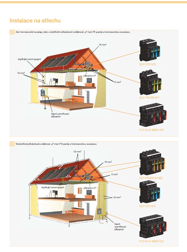 Pokud ne, tak co nejblíže panelů umístíš T1, před měničem v každém případě T2 a za měničem také T2. Propojení konstrukce přímo na vedení hromosvodu 16mm2 a ostatní 6mm2.