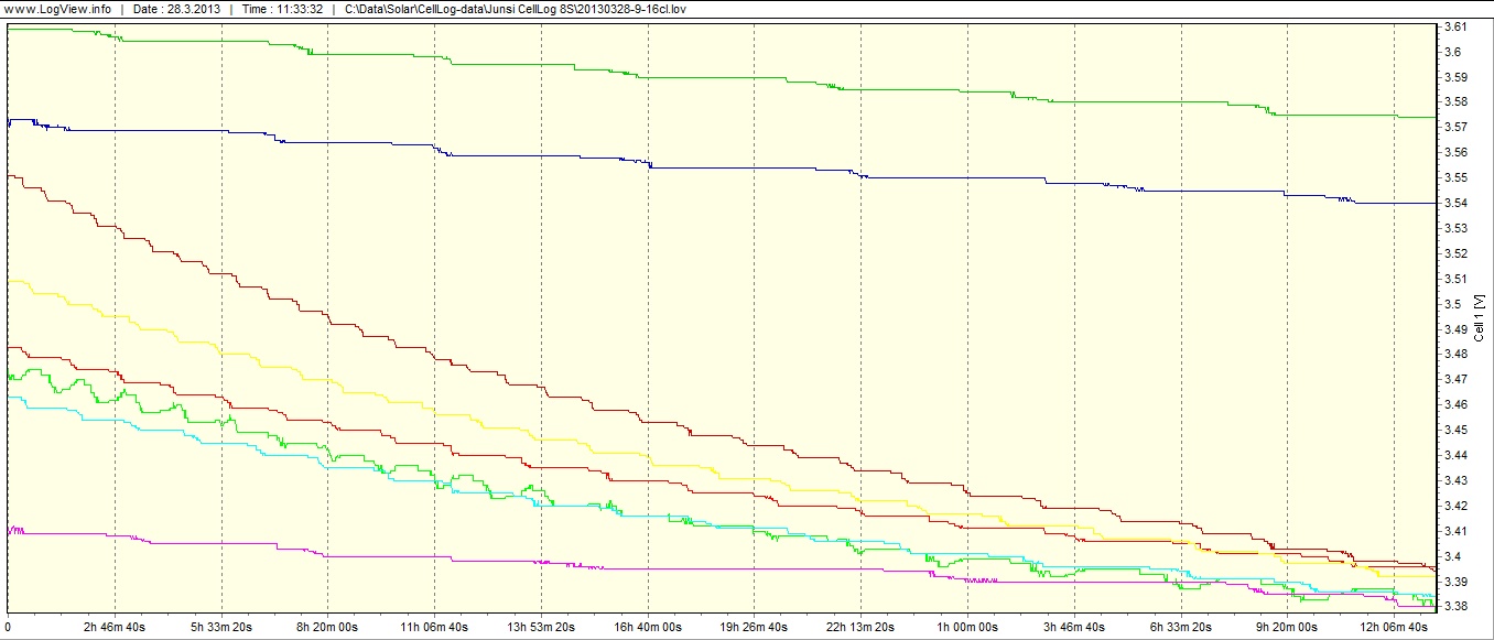 Přikládám dva grafy 2x8 100Ah článků po iniciačním nabíjení a jejich pokles napětí je logován Cell Logem. Je na nich krásně vidět, že 7mý a 8mý článek je méně zatížen Cell Logem a jeho napětí padá pomaleji.