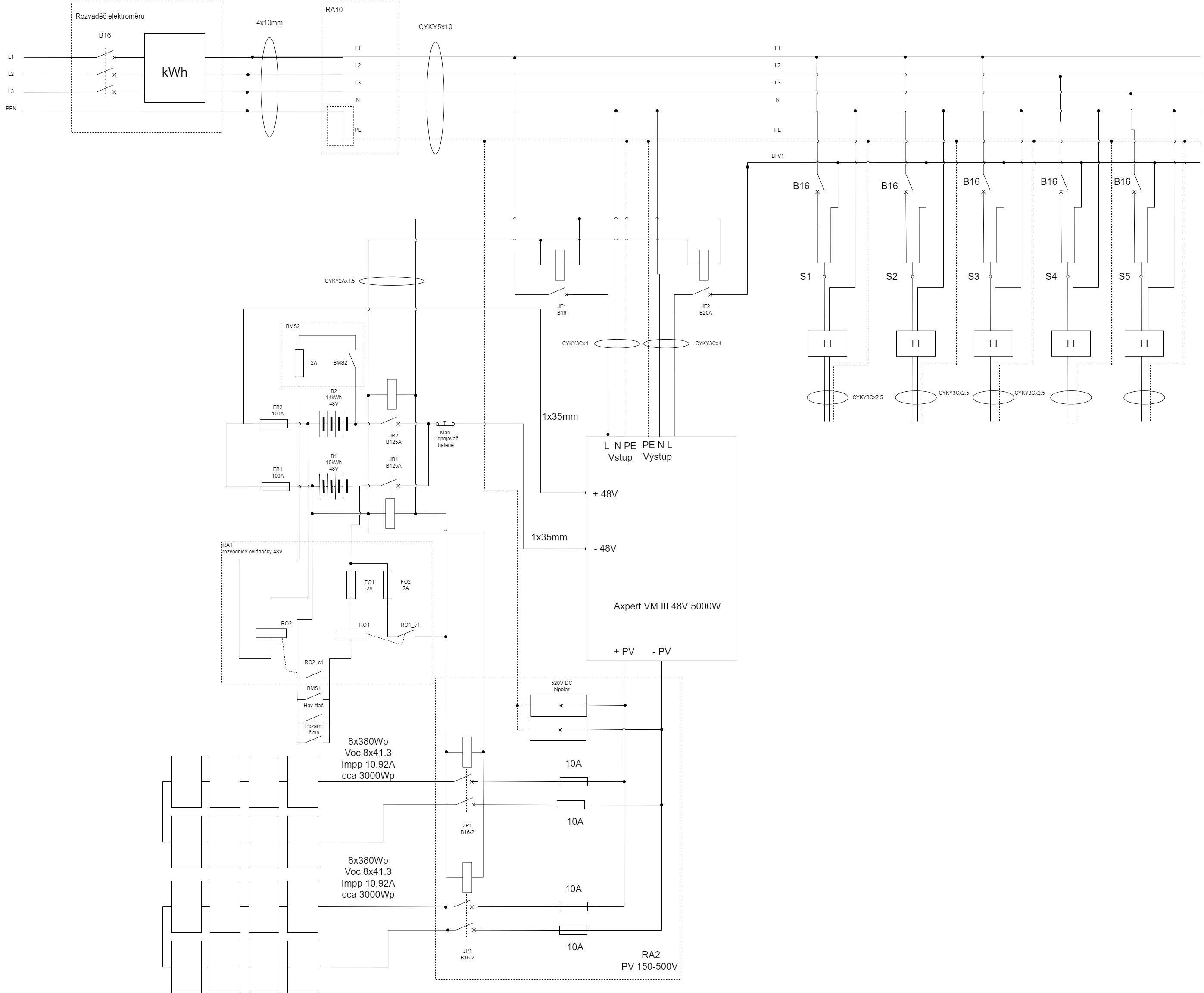 JJZ 2.3kWp+ JJZ 2.4 kWp , JV 2.4kWp , EASUN 5.5kw /48V , 280Ah/48V Lifepo4 . Částečný přepínací ostrov v RD .