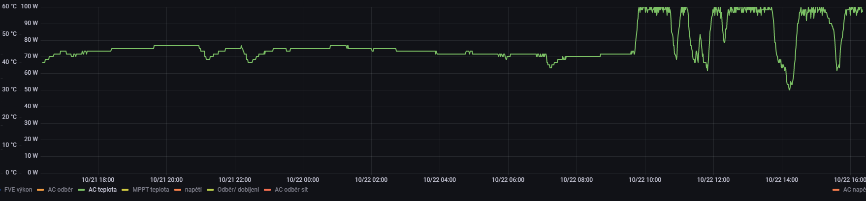 Tak jsem dnes nechal mixovat dobíjení ze sítě a panelů... Panely vyrobily dnes ubohou 1kwh pralo se do baterky stabilně mezi 20 až 28A. Aktuálně už to dojíždí a snižuje proud který je kolem 11A. Nechám to dojet do večera alespoň se baterie pěkně nabije což jí určitě neuškodí. Co mě zaujalo že měnič si drží kolem 60°C při nabíjení a profoukne to jen jednou za čas. V grafu jsou poklesy kdy začal chladit měnič jako celek při výrobě z panelů.