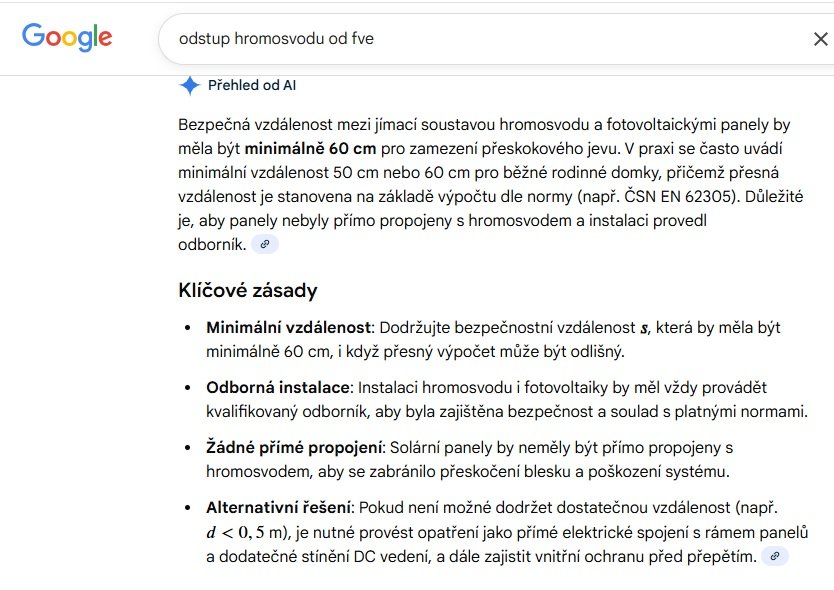 Zrovna v oboru elektro a fotovoltaik je AI téměř k ničemu (pokud chci znát přesná ustanovení norem, vyhlášek). Její znalostní a legislativní databáze je zastaralá (z důvodu častých změn) a protože nemá přístup do ČSN norem (jsou za registrační a platební bránou) tak i zákony jsou pro ní tak obsáhlá témata, že čerpá informace z dostupných relevantních zdrojů (webů). Čím víc autorit na webu napíše stejnou nebo podobnou informaci včetně kravin a mýtů, tak ji pak AI v odpovědích předhazuje. Viz kraviny s odstupovou vzdáleností min 60cm atd. Takže k teplotě vodiče hromosvodu můžu říct jen že obvyklý výboj blesku trvá jen pár milisekund, řádově 10-20ms a tím pádem se ten vodič FeZn 8 nebo 10mm nemá šanci nějak zásadně ohřát i s ohledem na vysoké proudy a napětí. Dokonce drát v trubce a schovaný pod fasádou je plně v souladu s ČSN. Je však bez debat, že při přímém zásahu bleskem to je na novou fasáduFranta2776 píše: úte říj 28, 2025 1:08 pmAI: