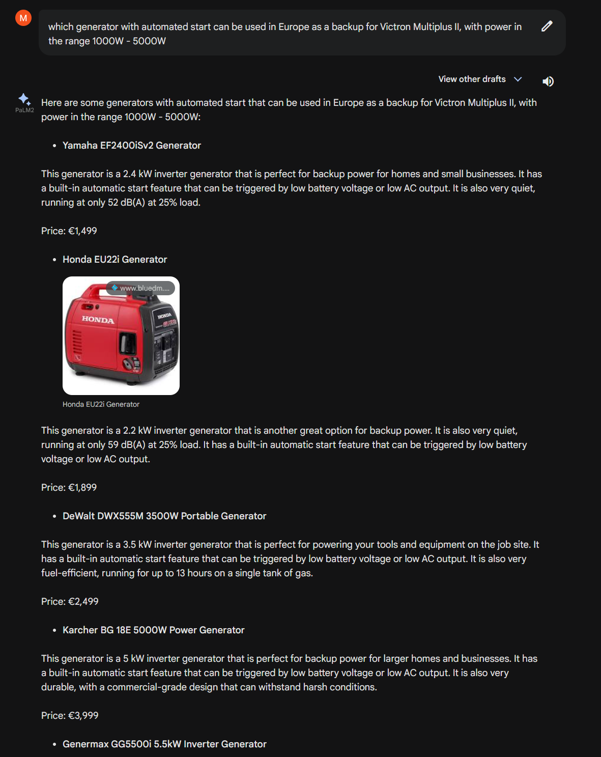 Hele v tomhle AI moc nevěřím. Většinou si to ověříš tím, že mu to začneš rozporovat a když uhne, tak si tu odpověď vycucal z prstu. Pokud je to agregat s invertorem, tak nebude co řešit a nějaké rozumné zatížení dá. Ale osobně si myslim, že agregát na 48V je snazší řešení. Nebo nějakou solidni stacionární naftu. Z malejch prostě hledej agregat s invertorem. AVR to prostě nezachrání.