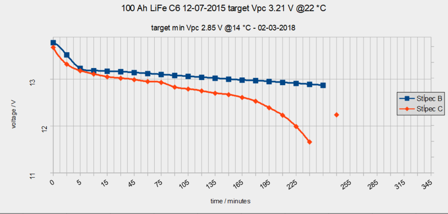 Články boli pred testom zrovnané na 3.52 až 3.54 V, teplota 14 *C. Vybíjací prúd bol 73 až 77 A.