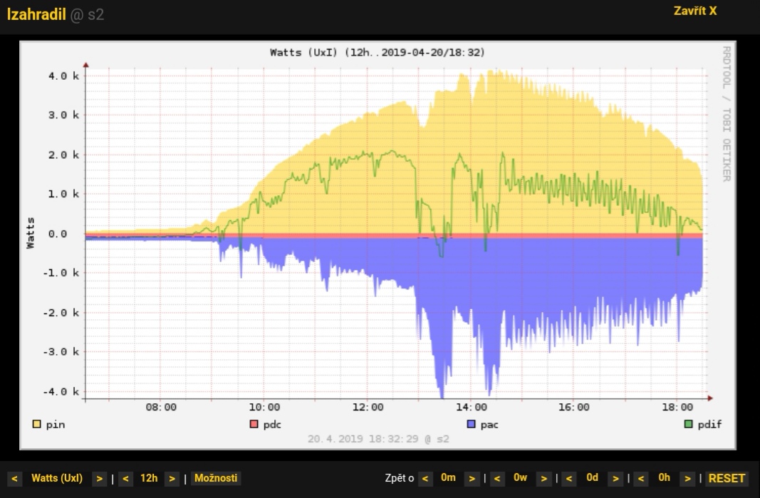 To je divne, jak to chlapi delate? Mozna je to kopcem za chatou, nebo mi uz zoxidovaly cokoladky pod panelama coby kabelove spoje ... 2.24kwp na strese, z toho 360Wp nemerim, pac mi odeslo na te vetvi proudove cidlo a asi rok jsem liny tam dat nove, i kdyz dve nove se vali na polici, takze 2.24kWp - 360Wp = 1.88kWp. Merena vyroba dnes 7.85kWh / 1.88kWp = 4.1kWh / 1kWp ...