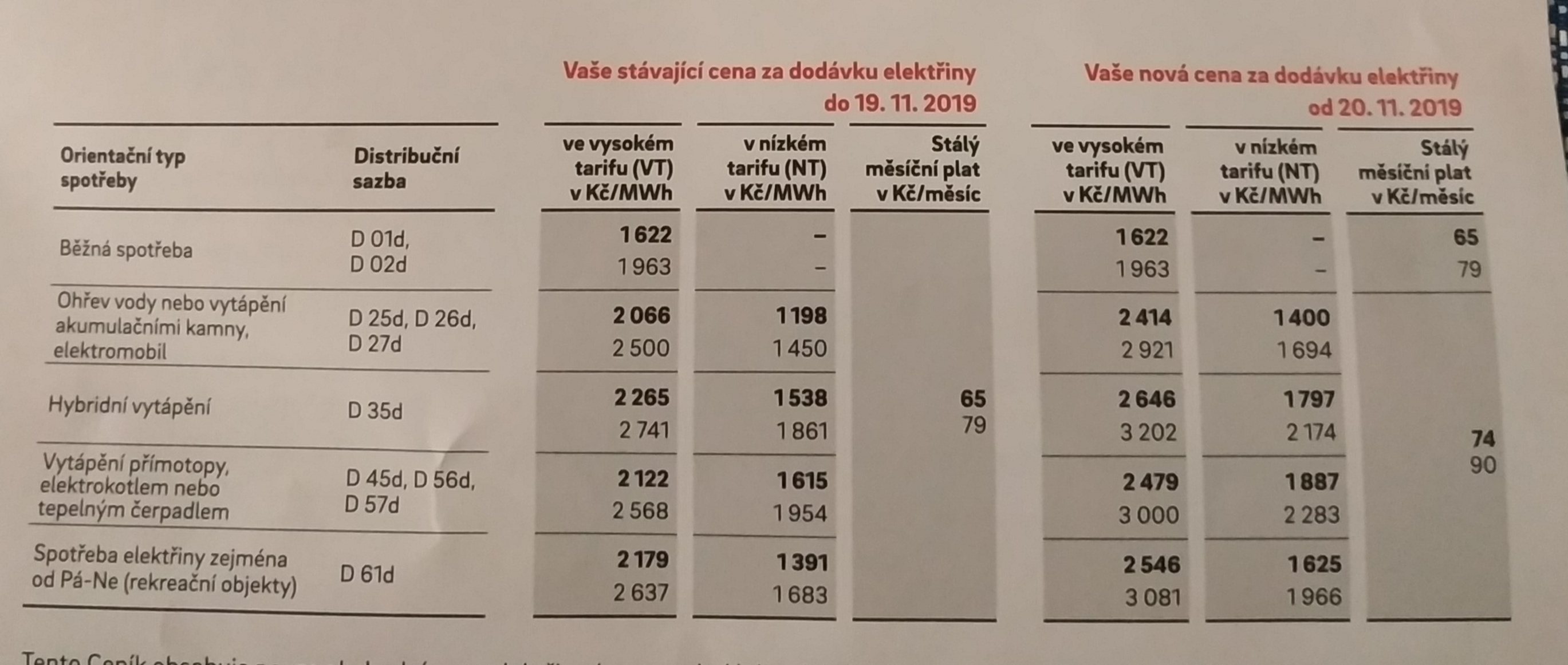 ...a mile oznamují, že nám zvyšují cenu ve VT o 42 haléřů a v NT o 24,5 haléře. Rozumněj ve VT bude cena 5,81 Kč, v NT 2,545 Kč. A stálý měsíční plat se upravuje ze 79 Kč na 90 Kč.