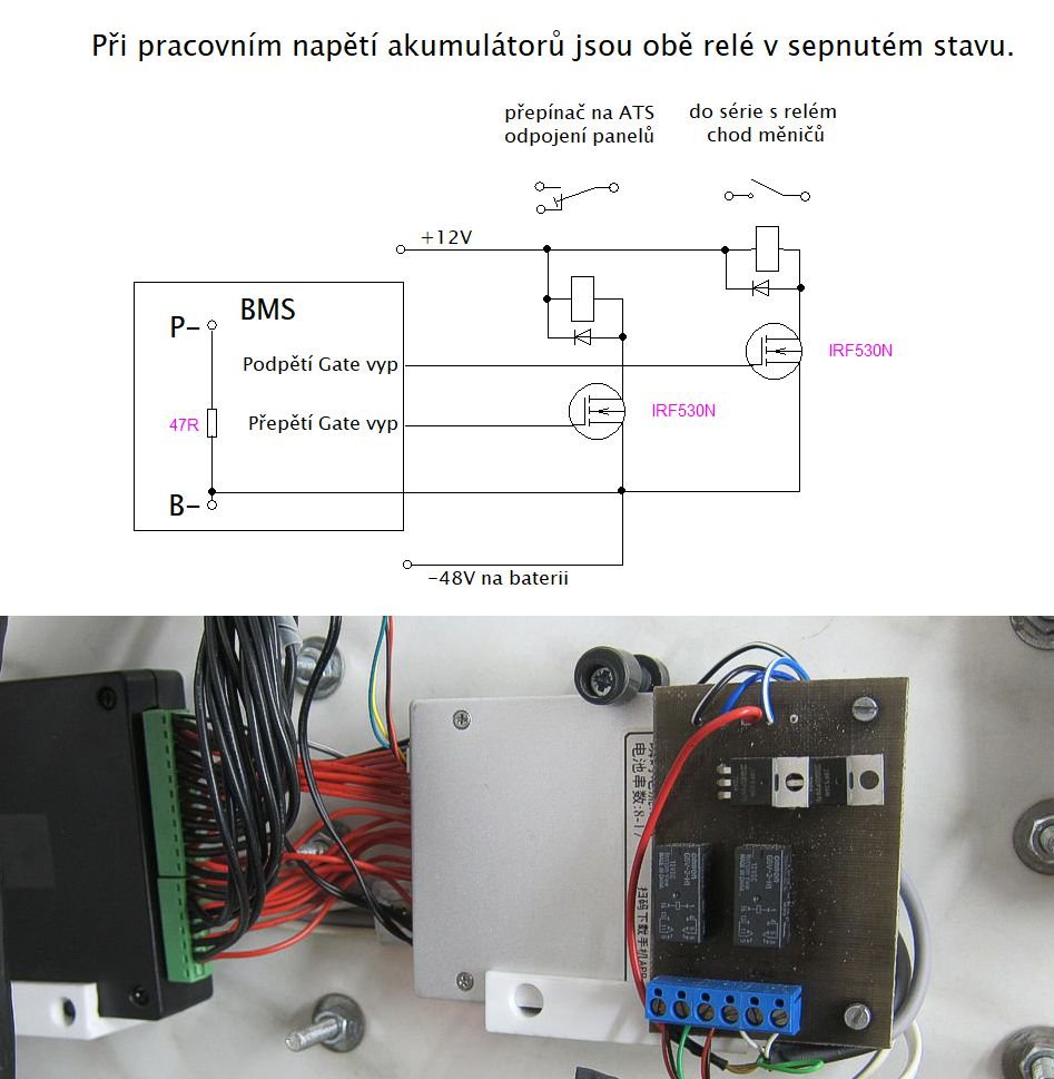 Já taky BMS využívám pouze k monitoringu a balancování. Zapojil jsem to podle alextccz : viewtopic.php?f=39&t=9052 a při přepětí článku mi to vypne přívod od panelů do regulátoru a při podpětí měniče. Nevidím v tom problém.