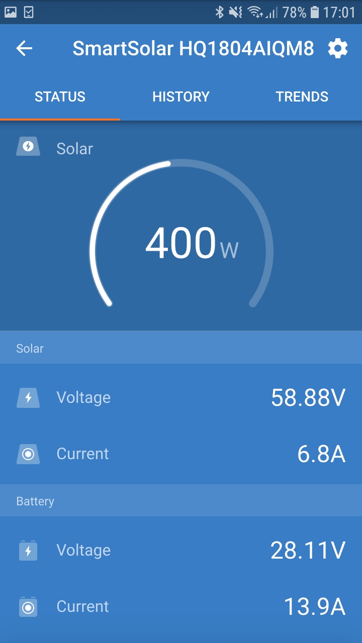 Z dvoch panelov, čo mi predal mobilik, 2 x 280 Wp, ktoré sú pripojené na Victron SmartSolar