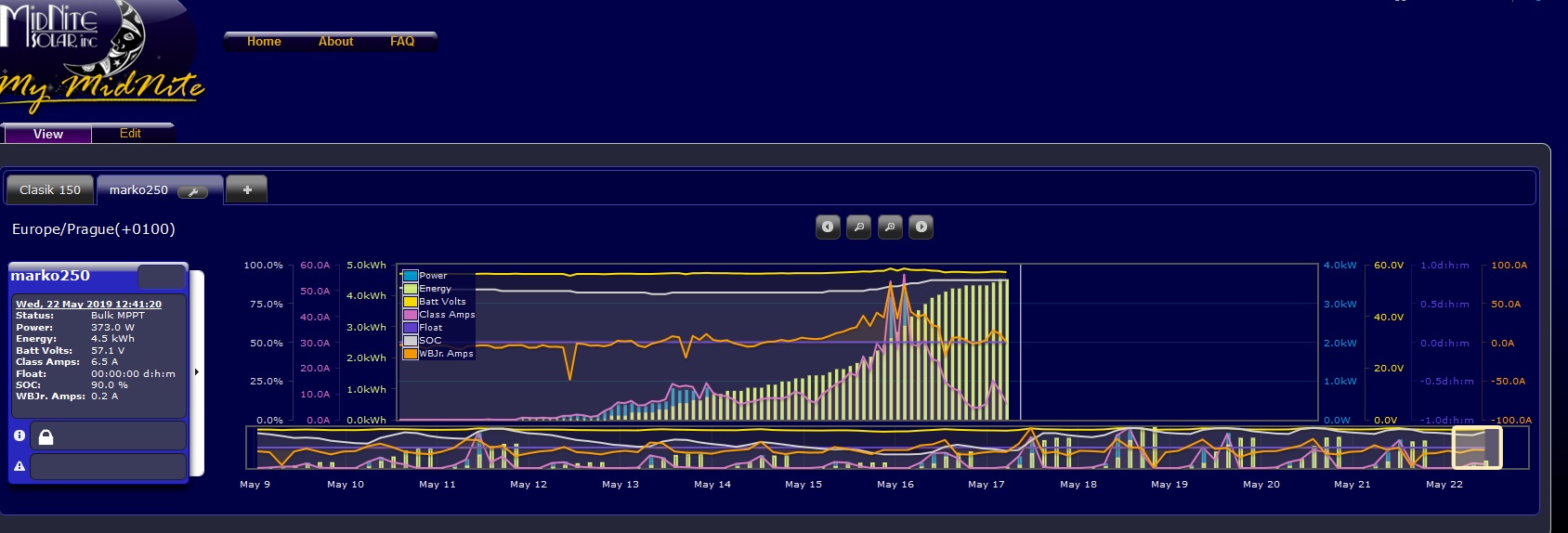 16kWp/JZ-50°/20xChaori 230 ,JV-90°/8xLeapton 650 + <JZ-90° /15xJAsolar / Mono 385, regl Midnite Classic 150<89A> , 1x EASUN <80A> a 1x EASUN <100A>,baterka 17s 54.4VDC LFP4/784Ah<uloží 42kWh>,ŠKATULE 11kW