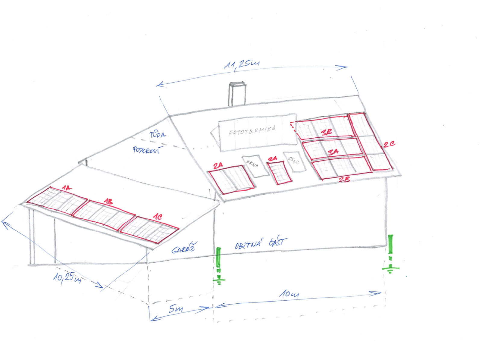 Na střeše budou osazeny panely dle první čmáranice: Jedná se tedy o samostatně stojící RD, bez bleskosvodu. Na střeše je roky fototermický panel a dvě střešní okna. Nic není uzemněno. Nově se realizuje osazení střešní konstrukce pro FVE panely. Konstrukce bude mezi sebou pospojena a uzemněna Cu 16mm2. Pospojení dovnitř domu vůbec nepůjde.