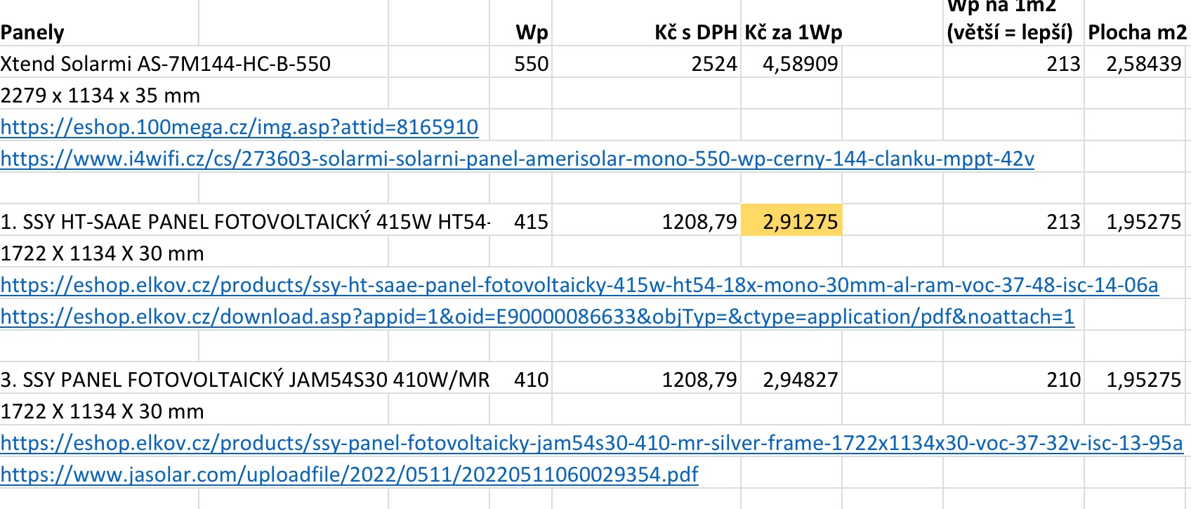 Ppps: diky za tip na tyhle panely 415Wp za 999,- (bez DPH), v soucasne dobe to je TOP nabidka (na kusovy mnozstvi) o levnejsich nevim. Prepocteno na plochu mi stejne vychazeji jakykoliv panely na cca 213Wp/m2 (coz odpovida ucinnosti 21% pri dopadu 1 kWp/m2) - akorat u tech velikych plachet by se mohlo usetrit za listy/upevneni, ale to cenu 415Wp za 999,- nedozene.