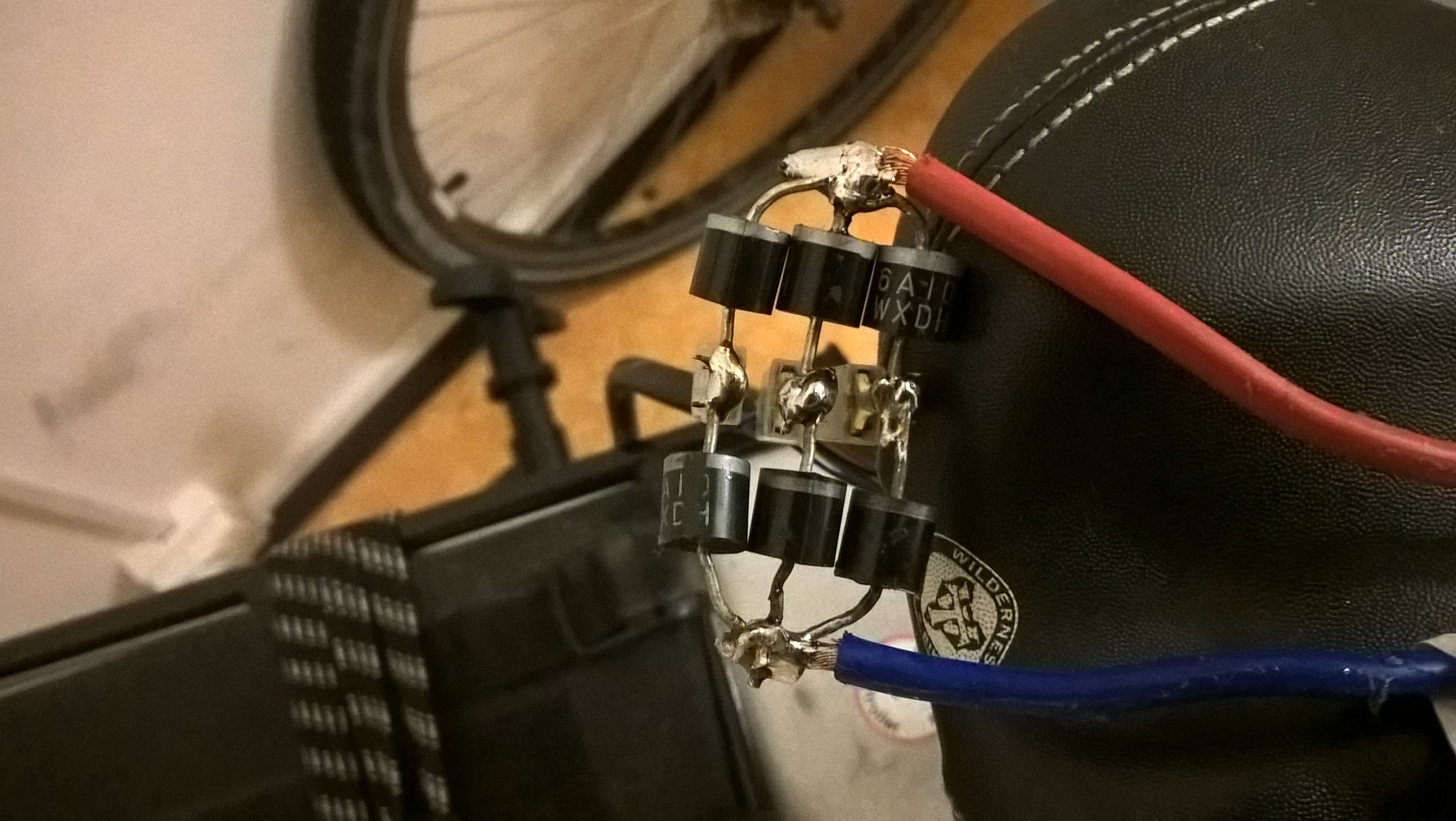připojil jsem k motoru usměrňovač 6x 1N5407 (3A diody) a 27V aku přes V-A-W metr od číňana.