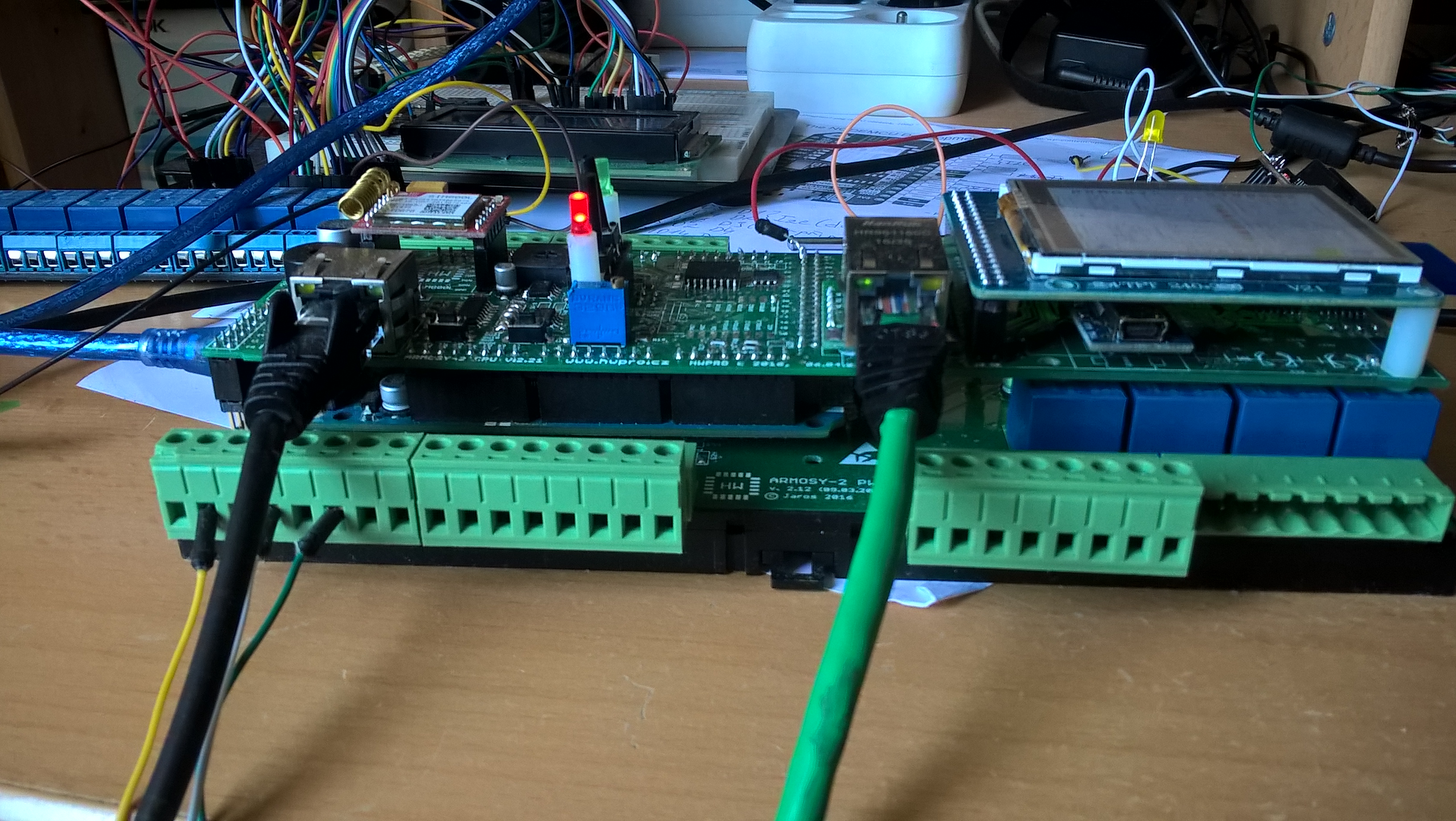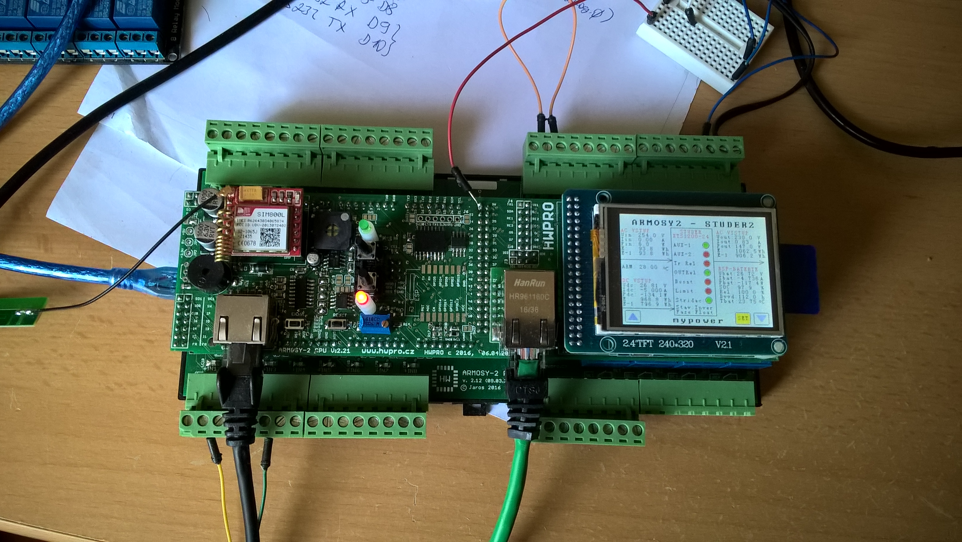 V základní sestavě ARMOSY obsahuje horní desku s dotykovým displejem, slotem pro MINI SD kartu, RTC obvodem s baterií, I2C EEPROM pamětí, 2x rozhraním RS-232, RS-485, dvěma tlačítky, dvěma LED, aktivním beepem a samozřejmě Arduinem DUE s programovacím kabelem. Spodní část je osazena 8x optočlenem oddělenými vstupy, 8x optočlenem oddělenými výstupy, měničem pro napájení v rozsahu 8~32V. Ostatní rozšíření je možné přidat z nabídky. Základní sestava stojí cca 3000,- Kč i s deskou DUE. Při klikání na různá rozšíření jsem se dostal cca na 7000,- Kč. Holt každá sranda něco stojí.