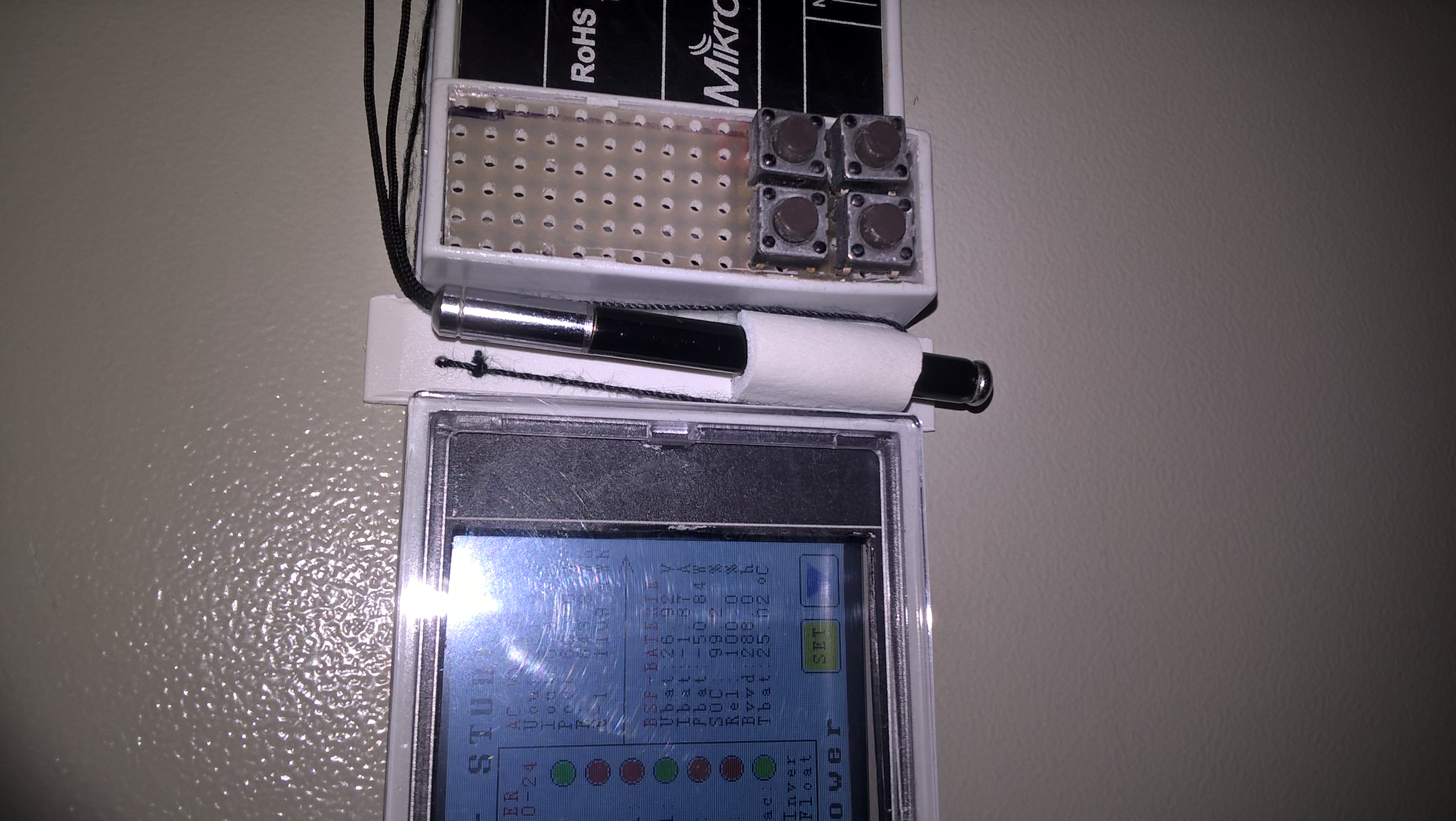 Tady je řešení jak umístit stylus na ovládání dotykového displeje. Použil jsem těsnění do oken, které se prodává běžně v obchodech a přilepil ho na zaslepovací kryt na jističe. (zaslepovací okénko). Snažil jsem se i o nahrání jak vypadají jednotlivé obrazovky, ale fotky můj telafon dělá při detailu takové, že je sem na fórum nejdou nahrát. Překračují 2M přidělené adminem, tak se zatím musíte kochat jen obrázky, co se vešly do limitu.
