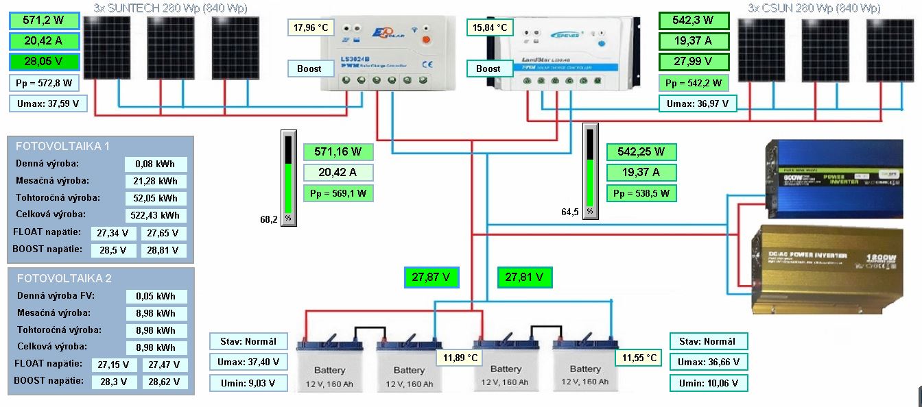 1,77kWp monokryštál + Fangpusun MPPT 150/45, 1,6kWp +Victron MPPT 250/60, 2xStuder XTM4048 + 25kWh LiFePO4, vlastny monitoring na https://www.mms-softec.sk/pip/