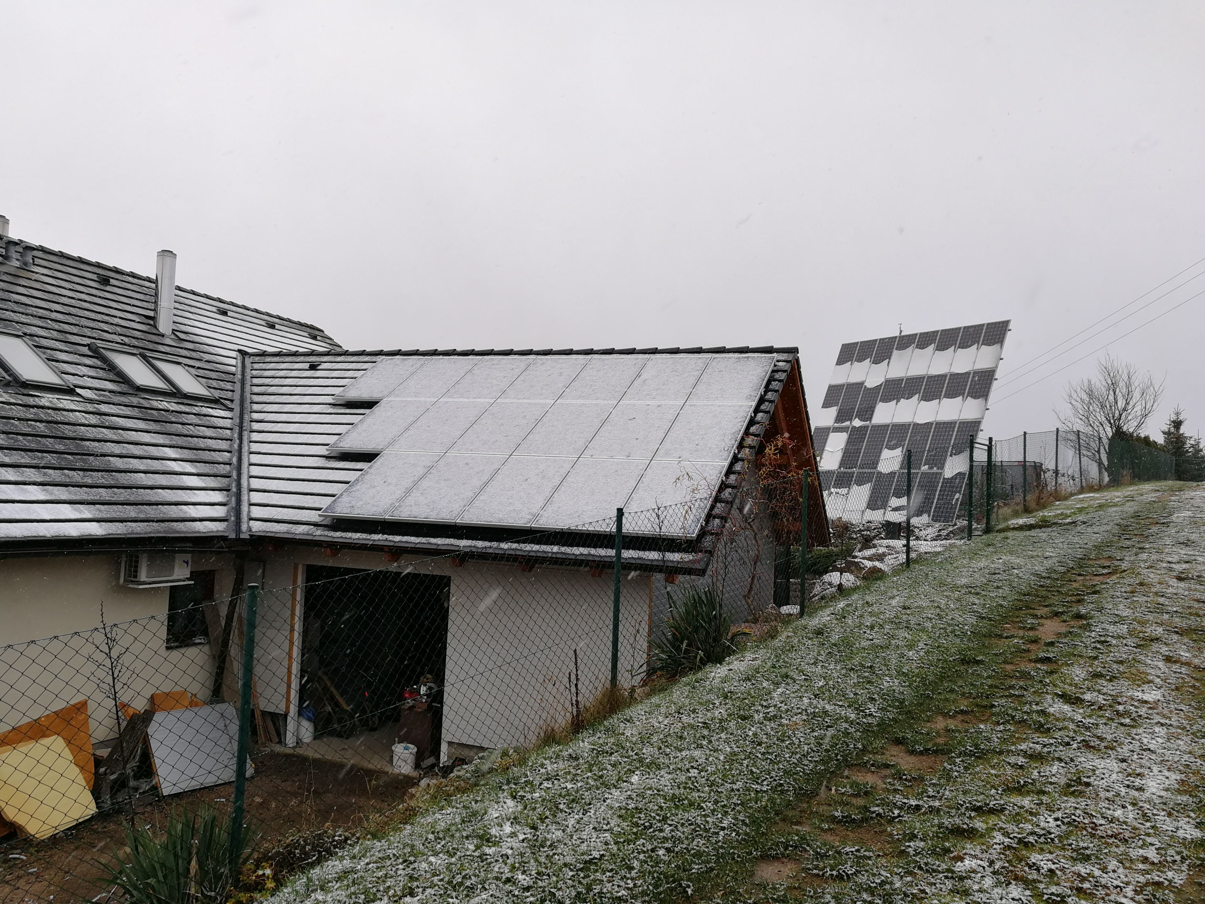tak jsem se po letní pauze dostal k instalaci panelů na JVV střechu 4kWp. Včera dokoncena instalace panelů a kabelů po kombiner box a dnes sníh. Jak se říká, za pět 12. Na jaře mě pak bude čekat ještě 4kWp na SZZ střeše (stejná písnička). Na fotce je krásně vidět, o kolik ochotněji sjíždí sníh z trackeru.