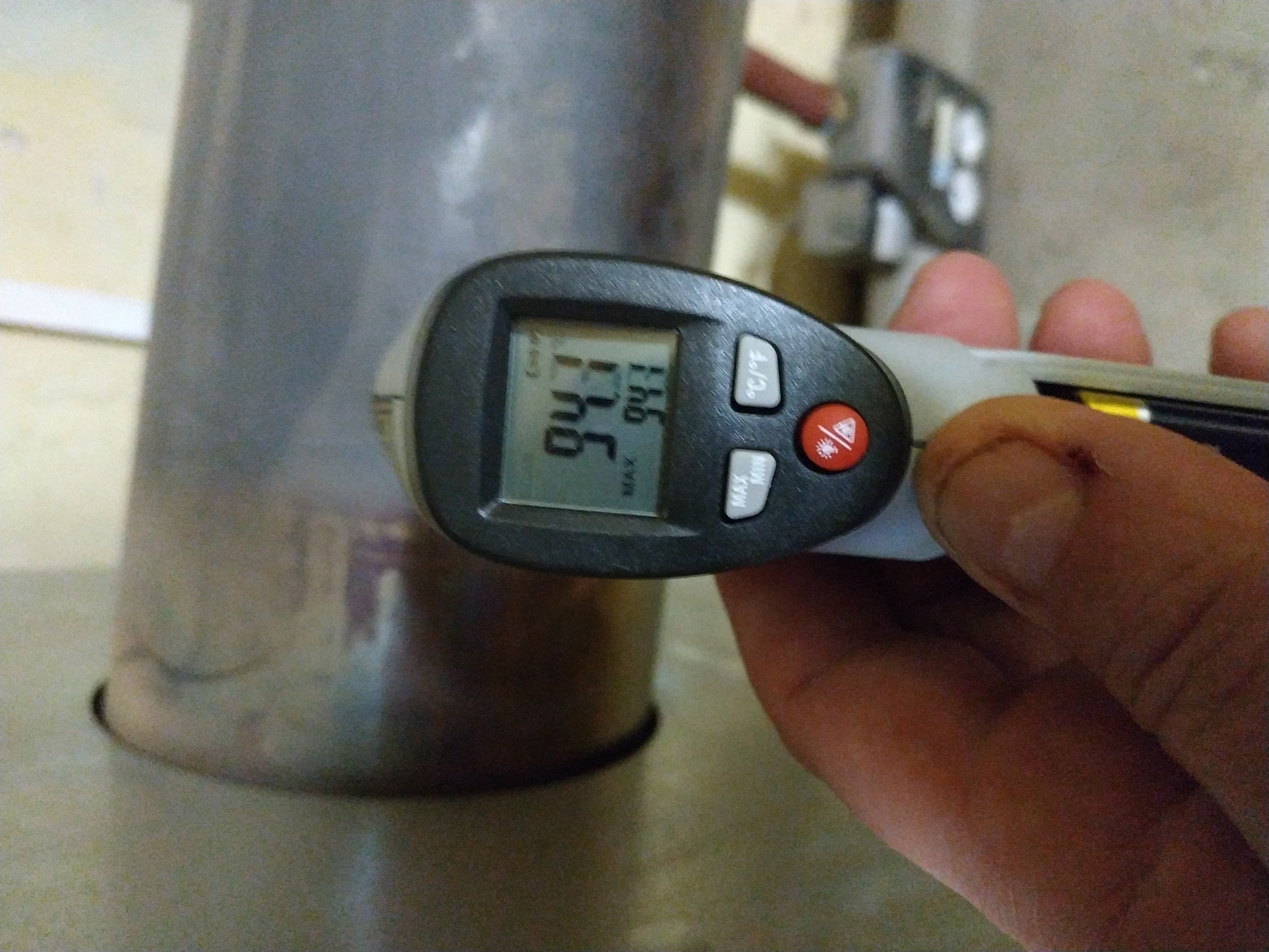 ten IR teploměr na lesklým nerezu měří nesmysl, je potřeba si tam udělat černý kolečko, řeba okouřit svíčkou, nebo barvou na krby, a bude to hned o 40°C víc...