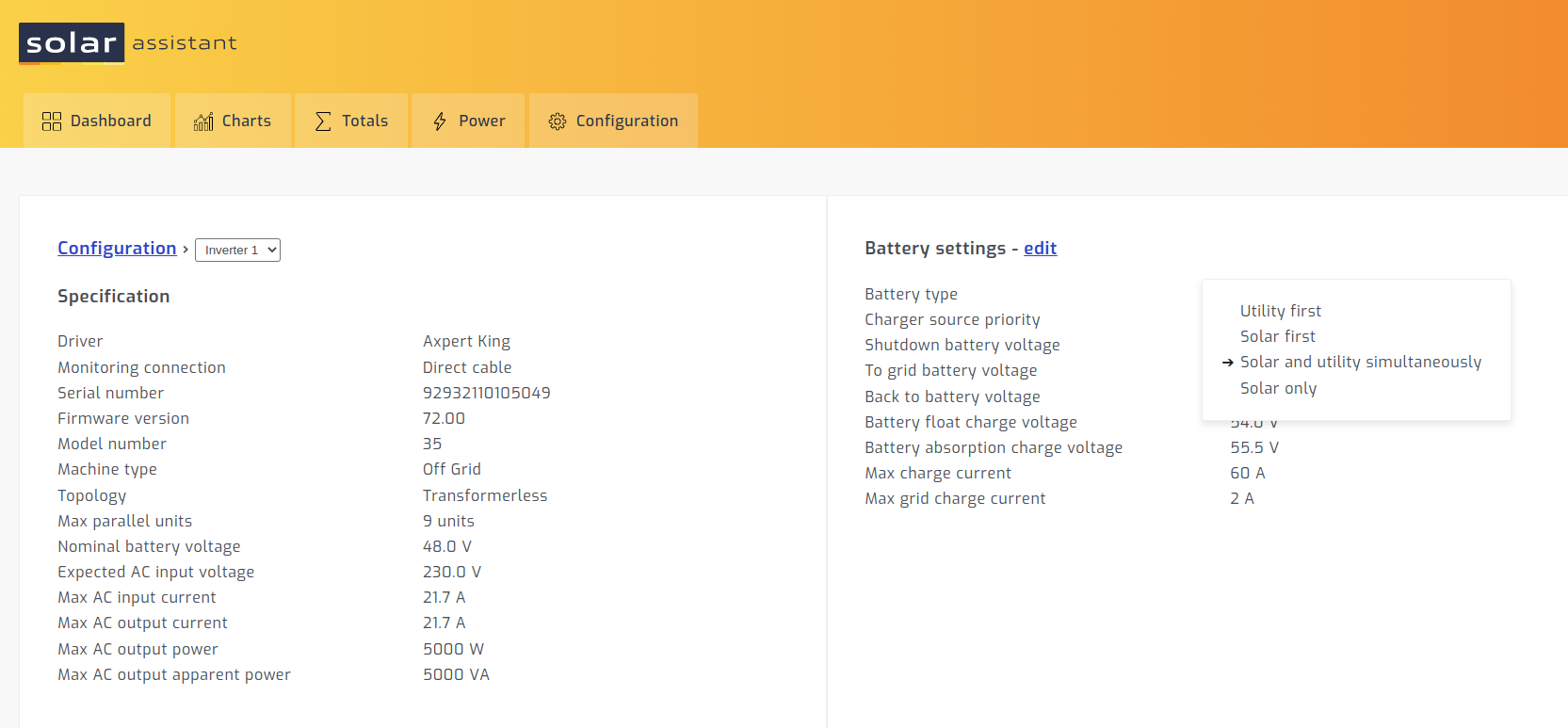 Jinak teď mám nastaveno SUB, SLB UDS (Solar only), provedl jsem restart, nic, tak default settings, znova nastavil baterie, restart a teď to funguje. Zkusil jsem přepnout na SBU pod zátěží a přepnul na docucávání z baterek, taky ok.
