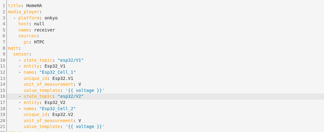 value_template: "{{ voltage }}"2x MUST PH1800 5.5kW, 9kWp V+J+Z, 600 Ah LiFePO4 s BMS JBD 200A, SW: Home Assistant na Synology DS923+ ku tomu ESPHome, Tasmota, MariaDB, InfluxDB, Telegraf, Grafana, Zigbee2MQTT..., HW: ESPlan (ESP32 + LAN 8720 + RS485). Nejaké moje projekty: MUST-ESPhome, ELTEK Flatpack2 ESPhome, ESP32-EMON, PZEM-017@WiFi, diyBMS-CurrentShunt-ESPhome , BMS UART-TS485 adaptér