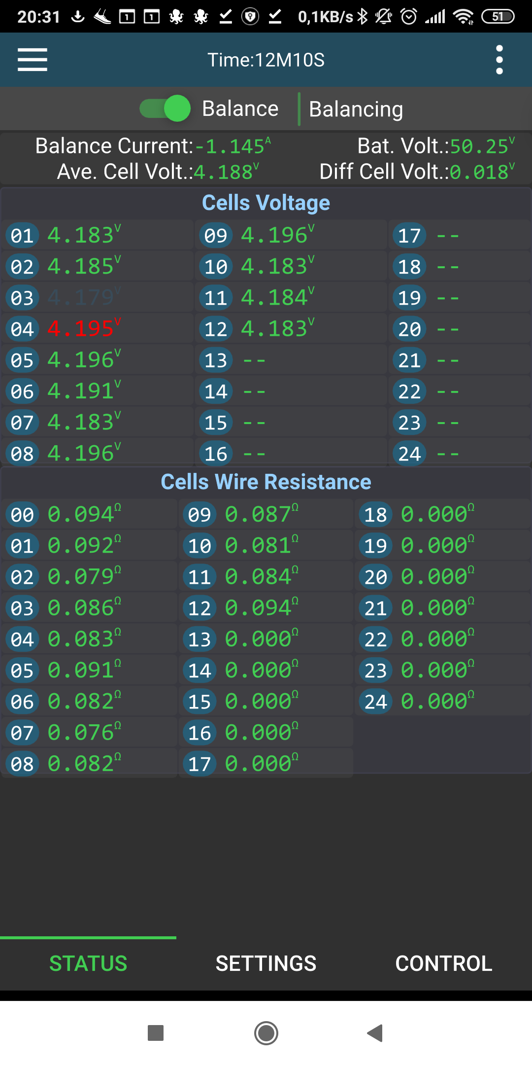 Ten balancer nedela nic jineho nez rovna hladiny mezi sebou. Omezeni v systemu 14S bude, ze nebudou nabijeny na vetsi napeti jak 14x4V tj. 56V resp. syst.mam nastaven na 55/54,5float vetsinou jede 54,3 v nabijeni a po nabiti padne 52,8-53V. Urcite nebudou prebijeny. Toto byl test balanceru a nehledal bych v tom problemtrud píše:Nie je mozne ten balancer nastavit aby koncil 4.15...alebo, 4.05?..4.25 im určite nerobí dobre.