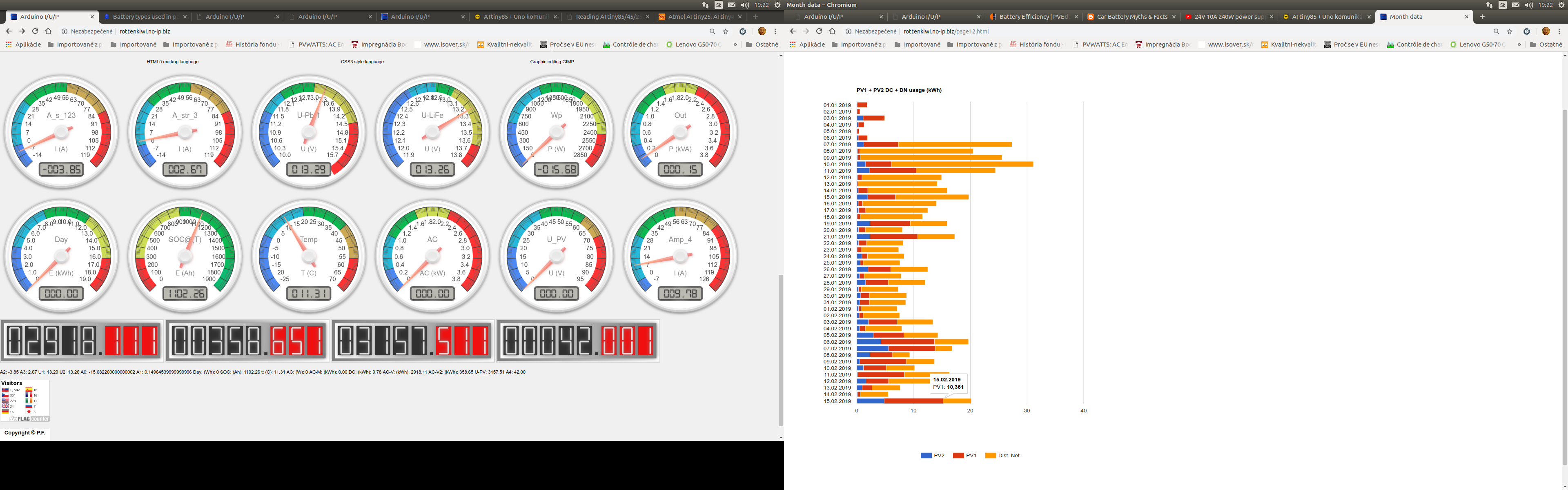 Dnes to bolo málo cez 15 kWh dokopy z 12 V a 24 V časti FVE. Bojler je nahriaty, celý deň topím