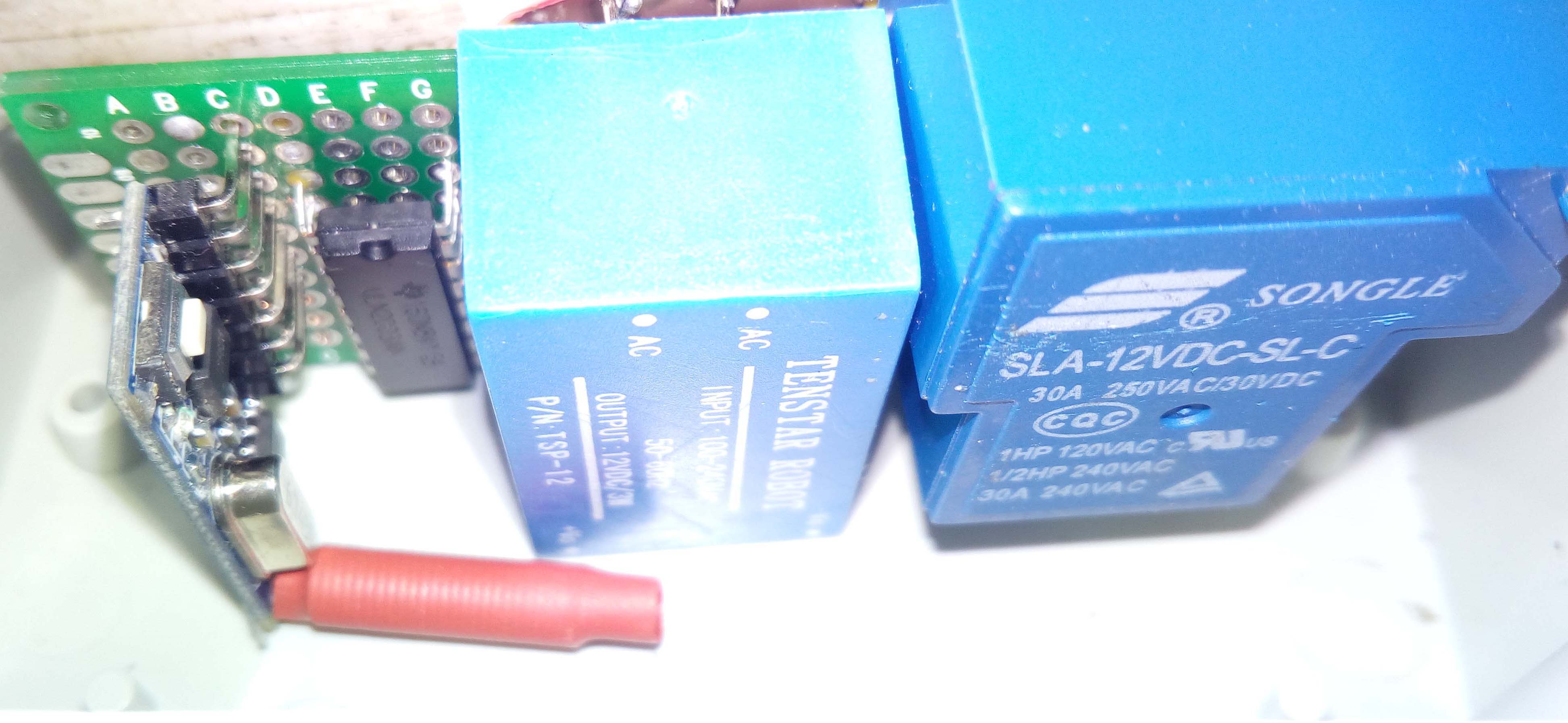 Jsou vidět programovací tlačítka na univerzálním relé, pomocí kterých tady nastavuji funkci a časové zpoždění relé. Vše pájitelné je na univerzální destičce.