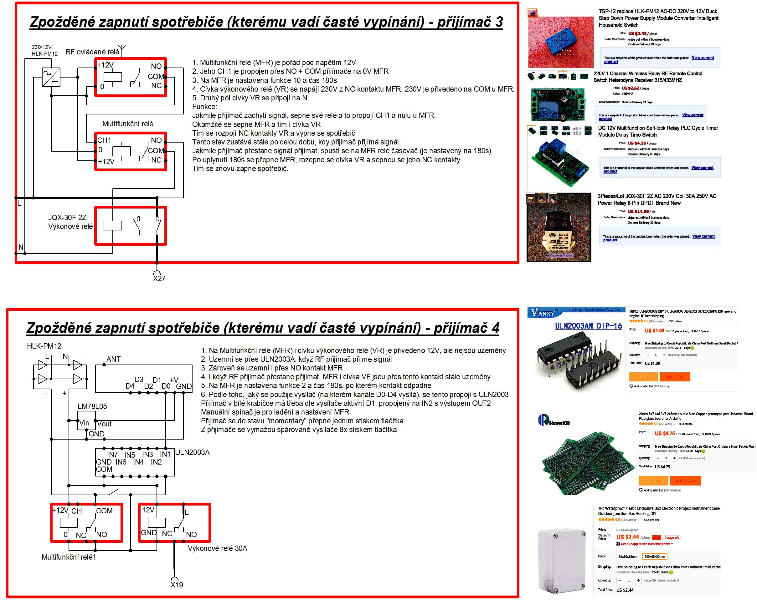 Přijímače mám splácané z čínských komponent, umístěné v krabičkách a jsou 4 typů - 2 varianty pro okamžité zpětné připojení a dvě varianty pro připojení s nastavitelným časovým zpožděním. Časové zpoždění proto, že některým spotřebičům vadí časté zapínání a vypínání a proto se u nich dá nastavit, za jak dlouho po vypnutí se zase mohou zapnout (třeba u klimatizace mám 180s)