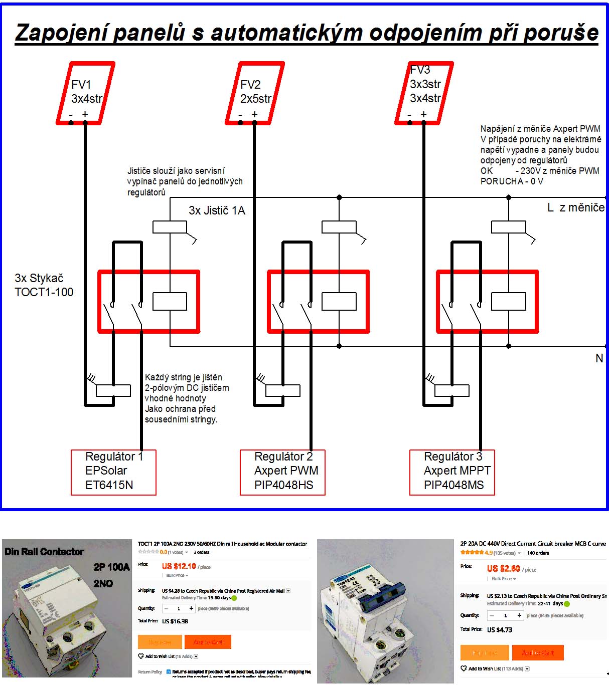 Komponenty jsou vybírané tak, aby byly za rozumnou cenu. U malé elektrárny je škoda utrácet velké částky za věci okolo, ale u velké už se to ztratí. Se stykači nebo jističi jsem zatím žádný problém neměl. Nákup z Číny je napínavější, protože při nákupu mnohdy nevím, co přesně přijde. A i když se neosvědčí, tak jsem s tím smířen. Kvůli číňanům i DPH koupím nejprve jeden kus a když se osvědčí, tak pak další a může se to použít v elektrárně.