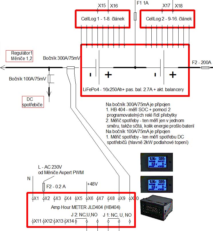 Pro sledování stavu nabití baterie, proteklé energie přes baterii a DC spotřeby používám 2 bočníky a 3 měřáky. Zároveň při dostatečném nabití se spouští využití přebytků - buď přímo 48V DC do podlahového topení 1800W, nebo 230V do spirály boileru.