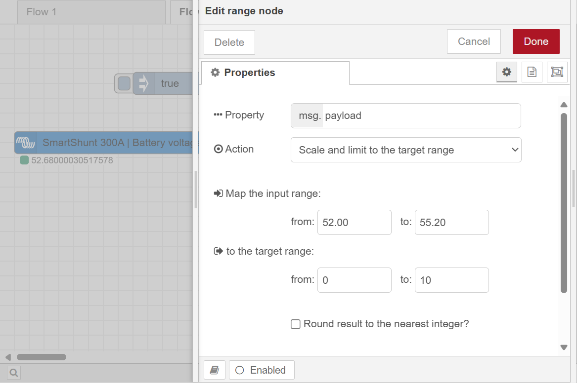 Použil jsem node "RANGE" a inject "TRUE", tam jsem nastavil na vstupu rozsah vstupního napětí baterie MIN-MAX, na výstupu se tento rozsah rovná