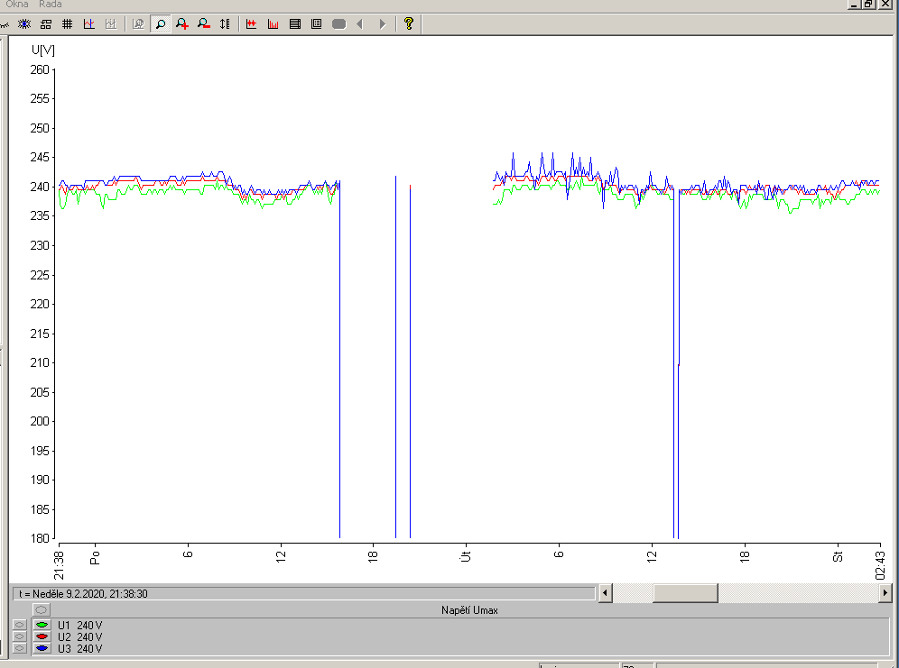 Tak ty toho nemí tolik co PAC, modbus tohle má také, jede to s ofic sw, případně s PLC, modbu jem s tím moc nerozbehal (asi jsem tomu nedal dost času) A takhle vypadá sít. v době fičáku. Z pohledu klasického odběratele ani nevíte, když to v době kdy jste v práci prostě vypnou.xmasin píše:Tohle znám, jsem taky cca 200 m od trafa, a napětí mně lítá mezi 235V a 245V, jednou jsem měl i 265V, ale to jsem u ČEZu reklamoval. Jinak norma je dneska +10% a -15% takže cokoliv v rozmezí 195,5V až do 253V je v pořádku.daffyx píše:2. jsem u trafa, takže 248V není problém, dle vyjádření +-10% dříve bylo +6 -10% je v normě.Já používám elektroměry od firmy Inepro, mají verzi s modbusem a umí měřit ledasco včetně přetoku.daffyx píše:Pro měření doporučuji využít tohle ( siemens PAC4200 nebo 5100) troufnu si říci že je to jinej level ne-li lepší... než ten čezakuv elektroměr.( myšleno klasika, ne ten 4kvadrant elmer)