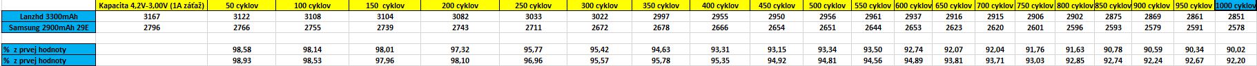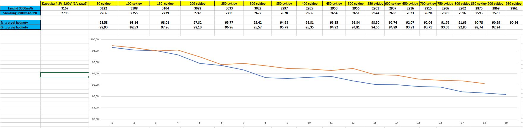 edit : ani neviem tvoju metodiku testovania, na prvej strane si mal cyklovanie 4.0V -> 3.4V, nabijaci prud do 1.5A (pri 3.3Ah clanku cize 0.5C) a vybijaci este mensi. To je taky neskutocny LUXUS pre clanky ze az, pri takomto pouzivani musia vydrzat 5.000 clankov len tak zahuci. Tlac ich na 4.2V a vydrzia polovicu, tlac ich do 3.0V alebo kusok menej a vydrzia zase polovicu.