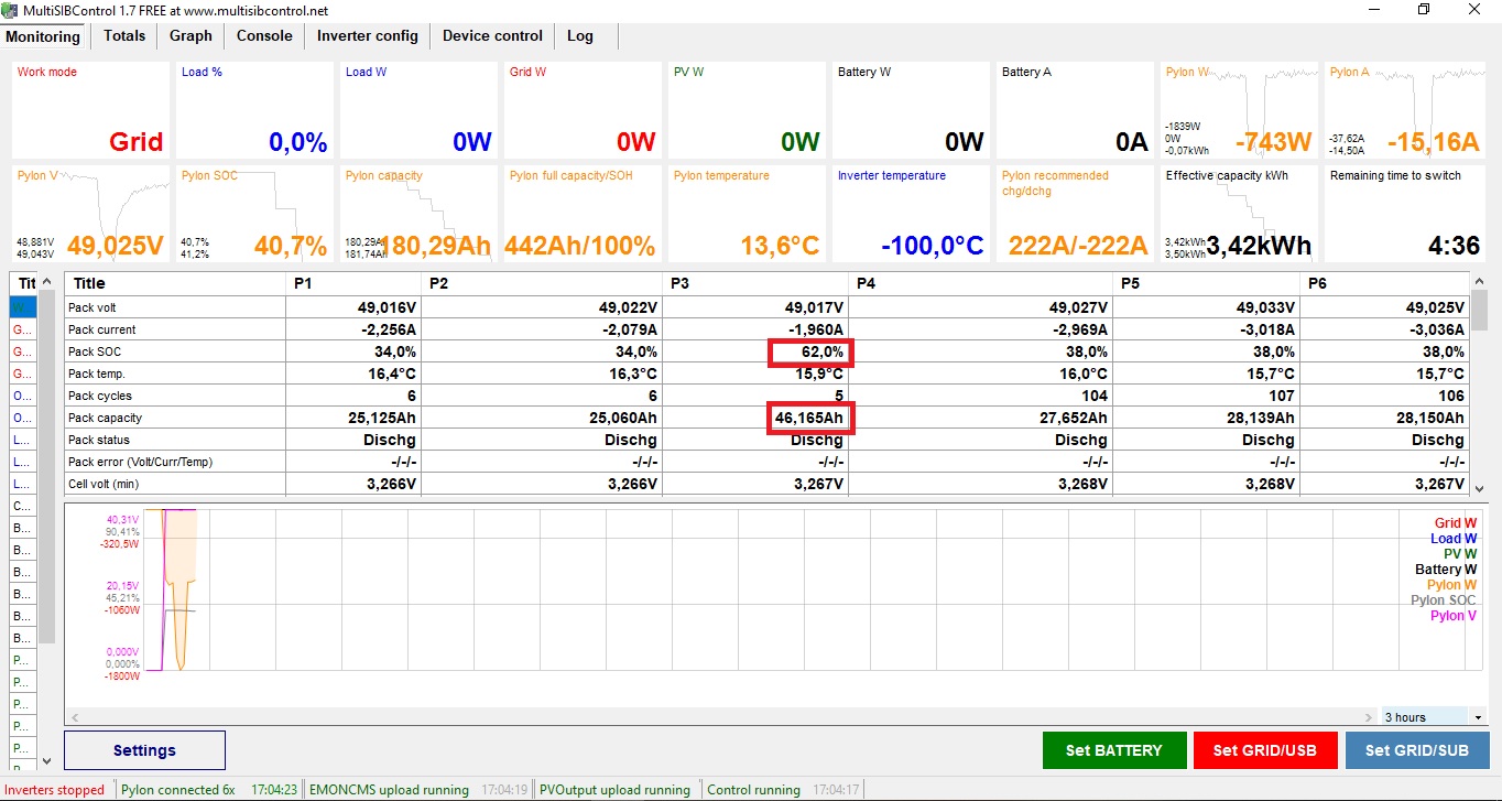 Skus nasledovne. Zhod MPPT, menic, vypni baterku. K menicu pripoj len pack #3, zapni baterku a vybijaj dovtedy, kym SOC nevypise len na packu #3 nevypise SOC 38%. Skontroluj programom. Vtedy vypni MPPT, menic a nechaj medzi sebou packy vybalancovat (pripojis medzi nimy len +-, komunikacny kabel nezapajas. Skonci to ked ledky prestanu blikat. Rano zapni vsetky baterky skontroluj cez program, zapni menic a MPPT. v priebehu nabijania kontroluj programom.