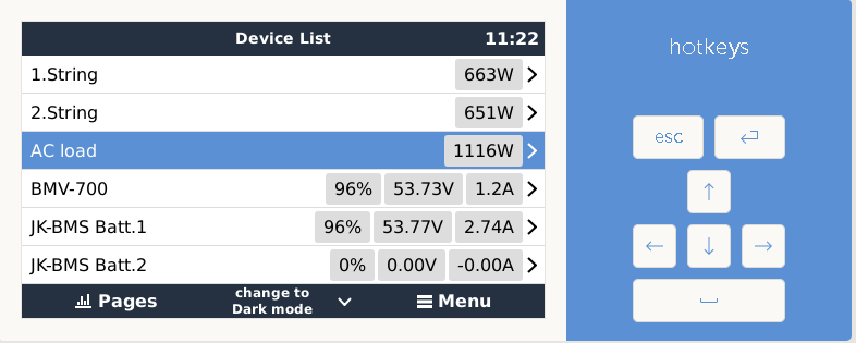 Tak jsem si pročetl návod k instalaci. Celý. Mě by se aktuálně měla týkat jen změna maximálního napětí baterie, kterou mám nastavenou vyšší, než původně v SW na 56,8V a můžu zpátky zapnout Alert v BRM. Nižší nabíjecí/vybíjecí proud než snese JK-BMS mi zatím nevadí, panely do třech paralelních větví více stejně nedají. Bluetooth se musí povelem zapínat, mám kabel, takže spojení Bth jsem netestoval. Jo a ten přepsaqný název zatím stále drží. Test změny parametrů v config.ini přes SSH a nano editor je tedy OK. Zatím to tedy vypadá, že vše funguje jak má.